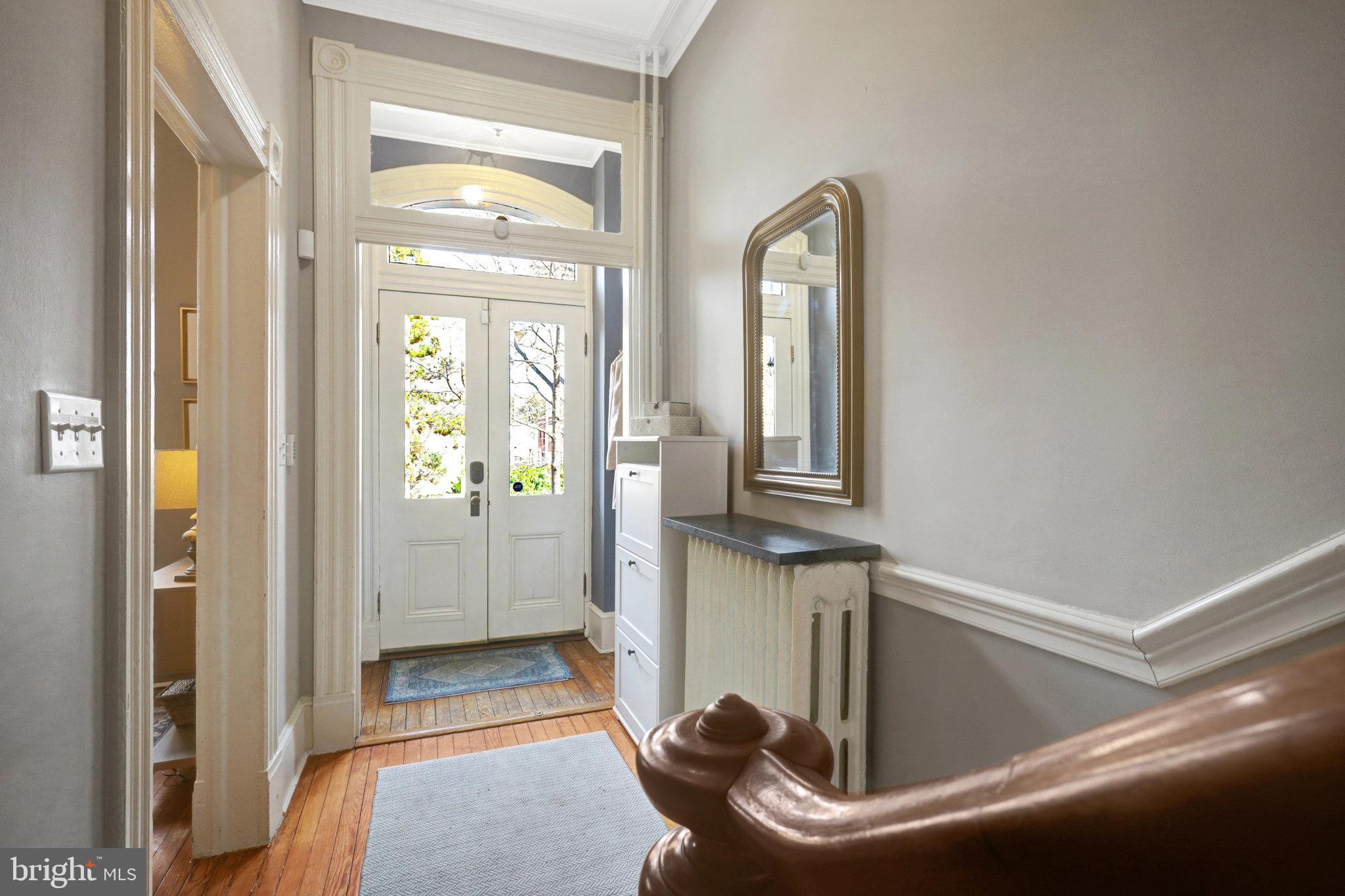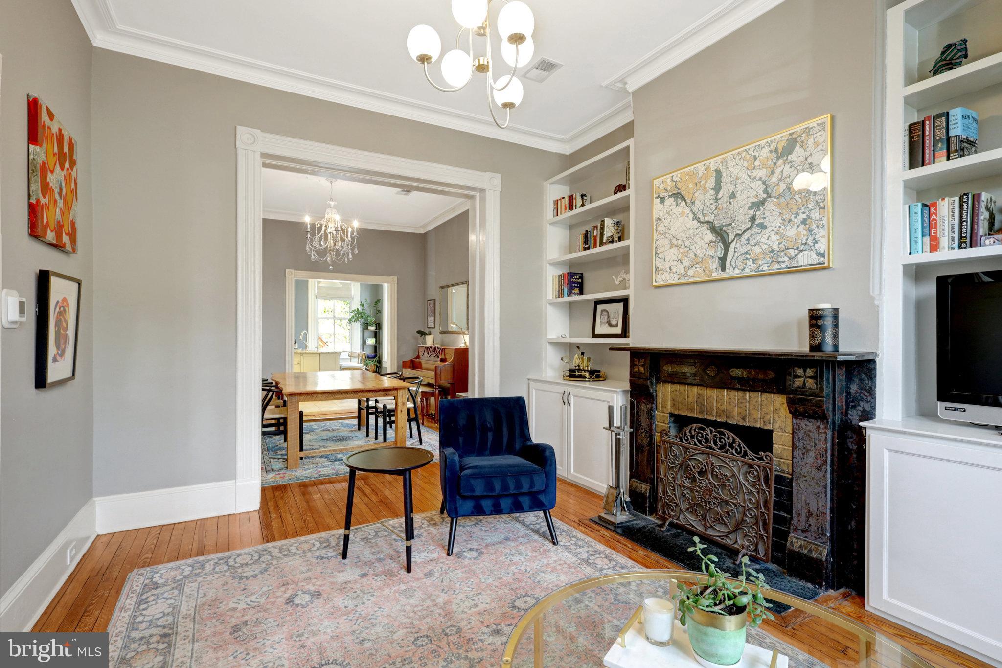 Upon entering through the formal vestibule, you are greeted by original hardwood floors and intricate woodwork that speak to the home's storied past. The main floor's Living Room exudes warmth with one of the two charming Wood-Burning Fireplaces, embraced by built-in bookcases and illuminated by a traditional bay window. A stunning globed chandelier, suspended from a ceiling medallion, casts an elegant glow.