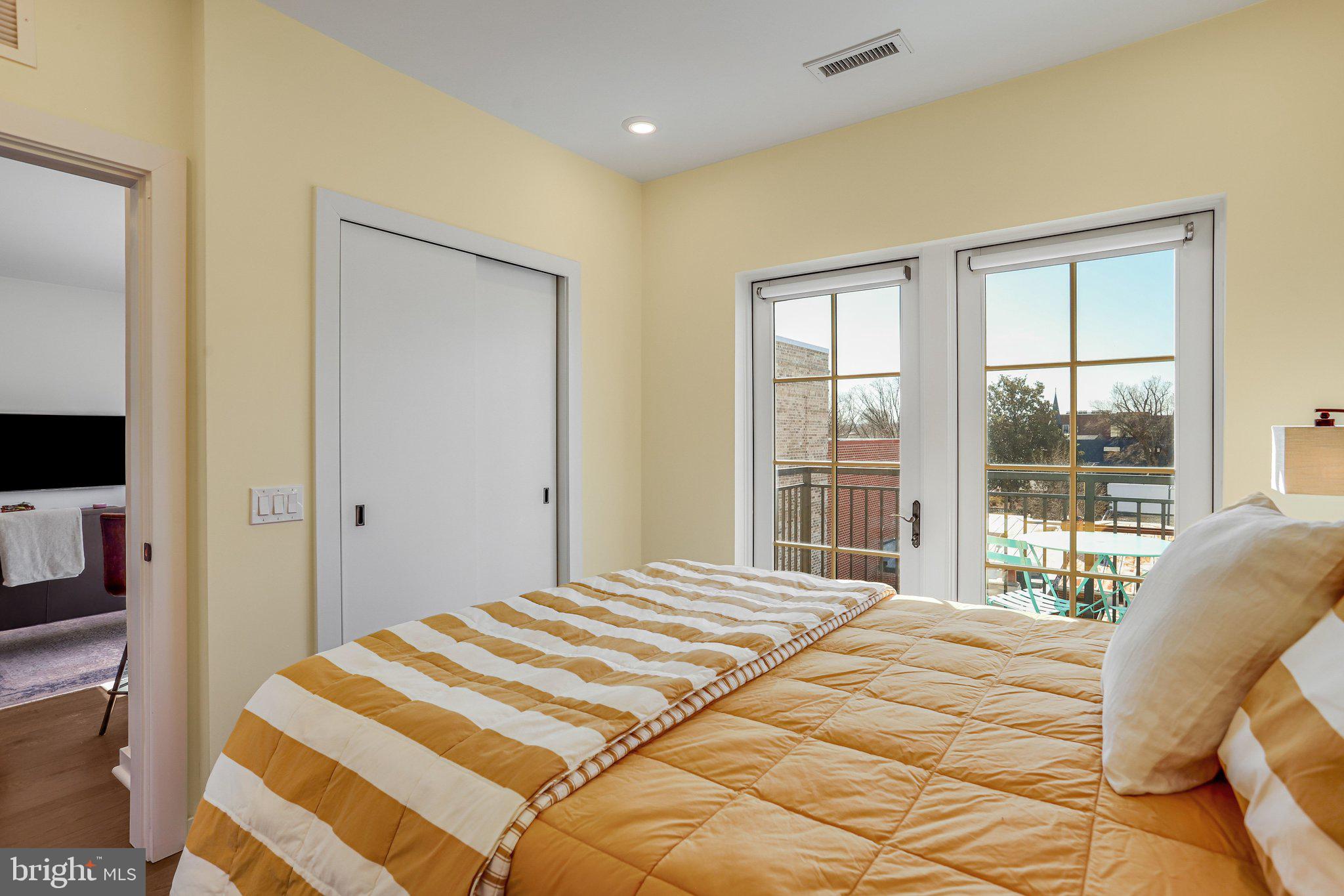 With its position on the top floor of the Boneval Condominium, there are no direct overhead neighbors. In addition, the unit looks South and West directly towards the Capitol, so you'll be hard pressed to find a more coveted location and City VIEW than that of #404. Upon entry, you'll find that the unit lives large for its footage, offering a perfectly proportioned open Living Room/ Kitchen/ Dining Space that works well for daily living and entertaining. Four oversized windows with automatic shades pour delightful sunlight upon the entire living area. A kitchen equipped with a dining island, high-end Bosch stainless appliances, and generous cabinet and counter space is both aesthetically pleasing and highly functional. A coat/storage closet and stacked laundry are tucked away adjacent to the kitchen. A bedroom suitable for a large bed set-up hosts a roomy storage closet and French doors, also equipped with automatic shades. Step out to the private balcony at any time of day or evening and appreciate the truly incredible skyline view of the Capitol and Library of Congress.