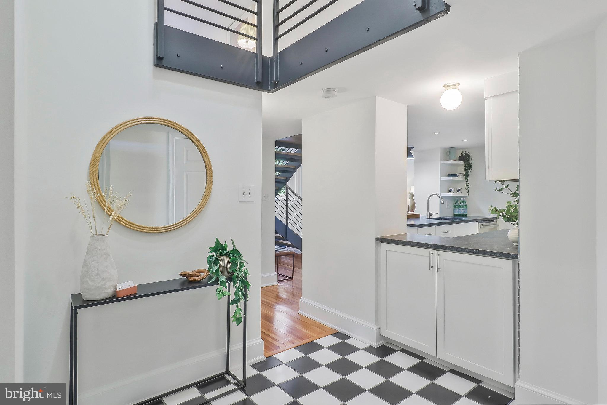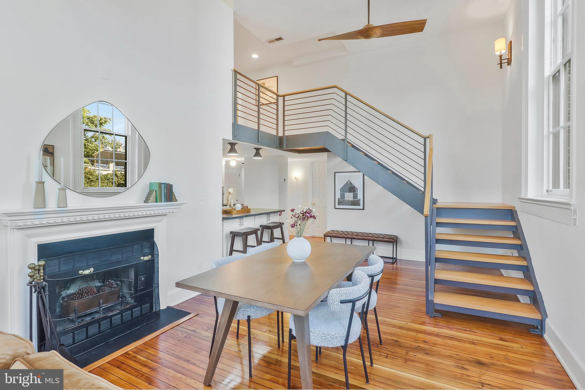 The entry hall has 2 useful closets and leads to a hall half-bath and the main floor BR/office. The kitchen with traditional black and white checkered tile is perfect for culinary enthusiasts, and the large open breakfast bar seamlessly connects to the oversized Living Room/Dining Room with decorative FP mantle. The soaring lofted ceiling amplifies the sense of space, while the four oversized windows flood the home with natural light, offering stunning neighborhood and garden views. An open winding staircase with a landing overlooking the LR/DR add a touch of architectural elegance, guiding you through the space.