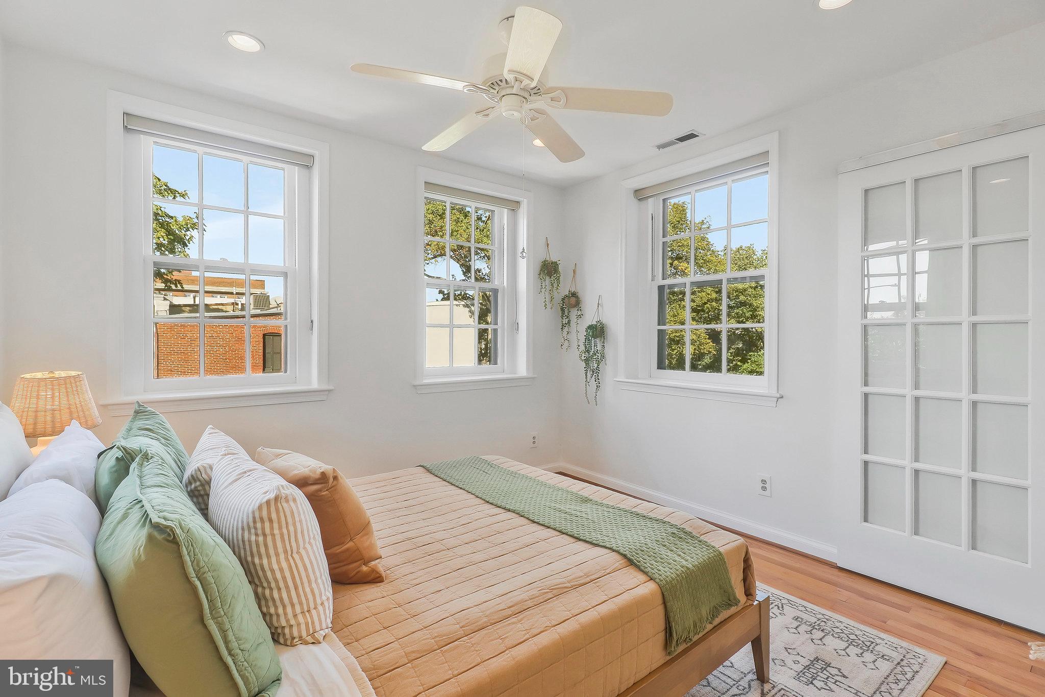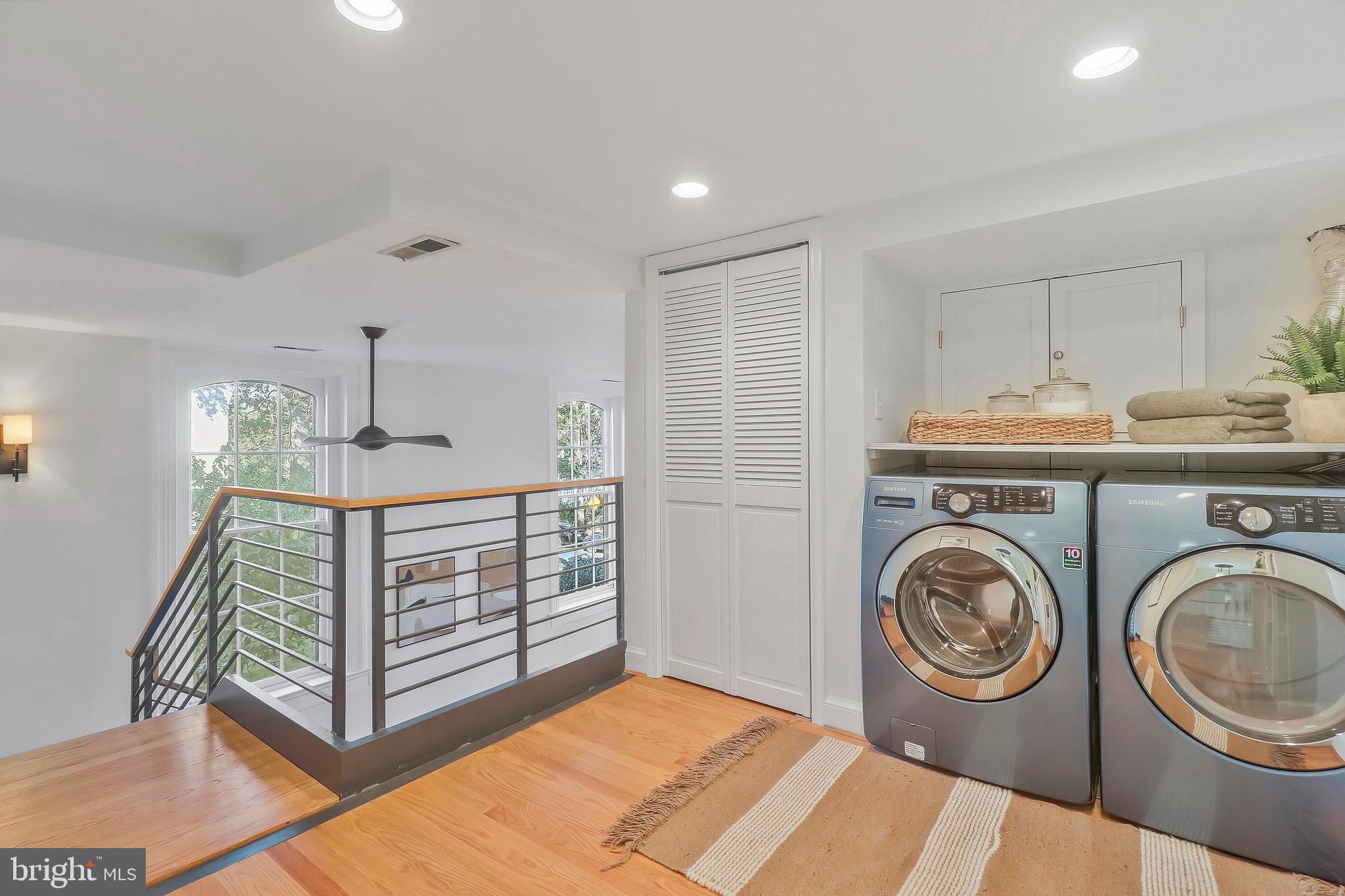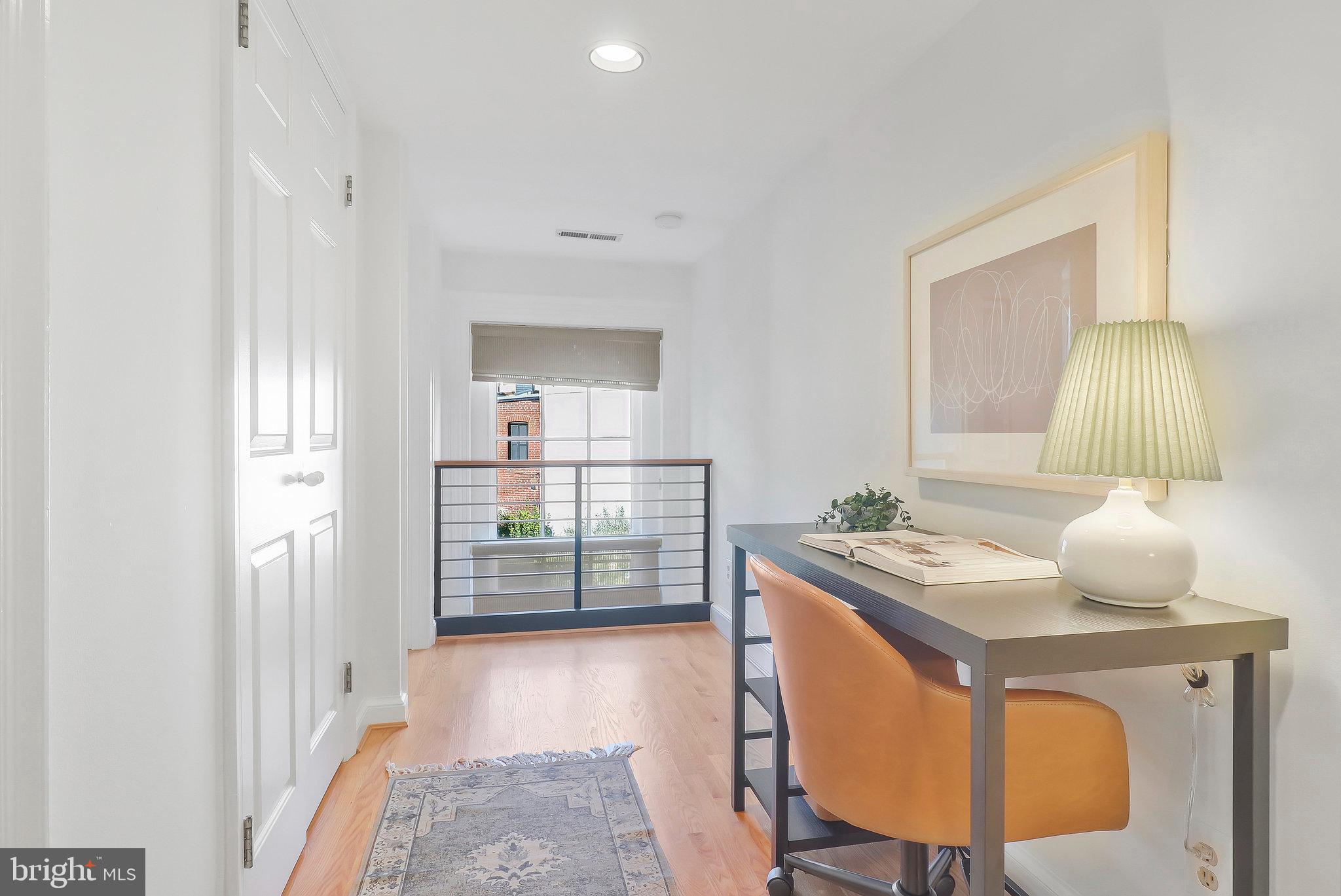 Upstairs is a utilitarian hallway lined with closets galore, a large in-unit laundry area with a washer and dryer, and an area large enough for a work-from-home space. At the end of the hall is the primary BR with large windows overlooking tree-lined and beautiful 5th ST.