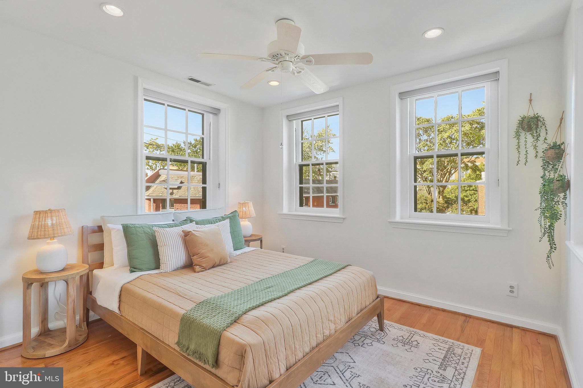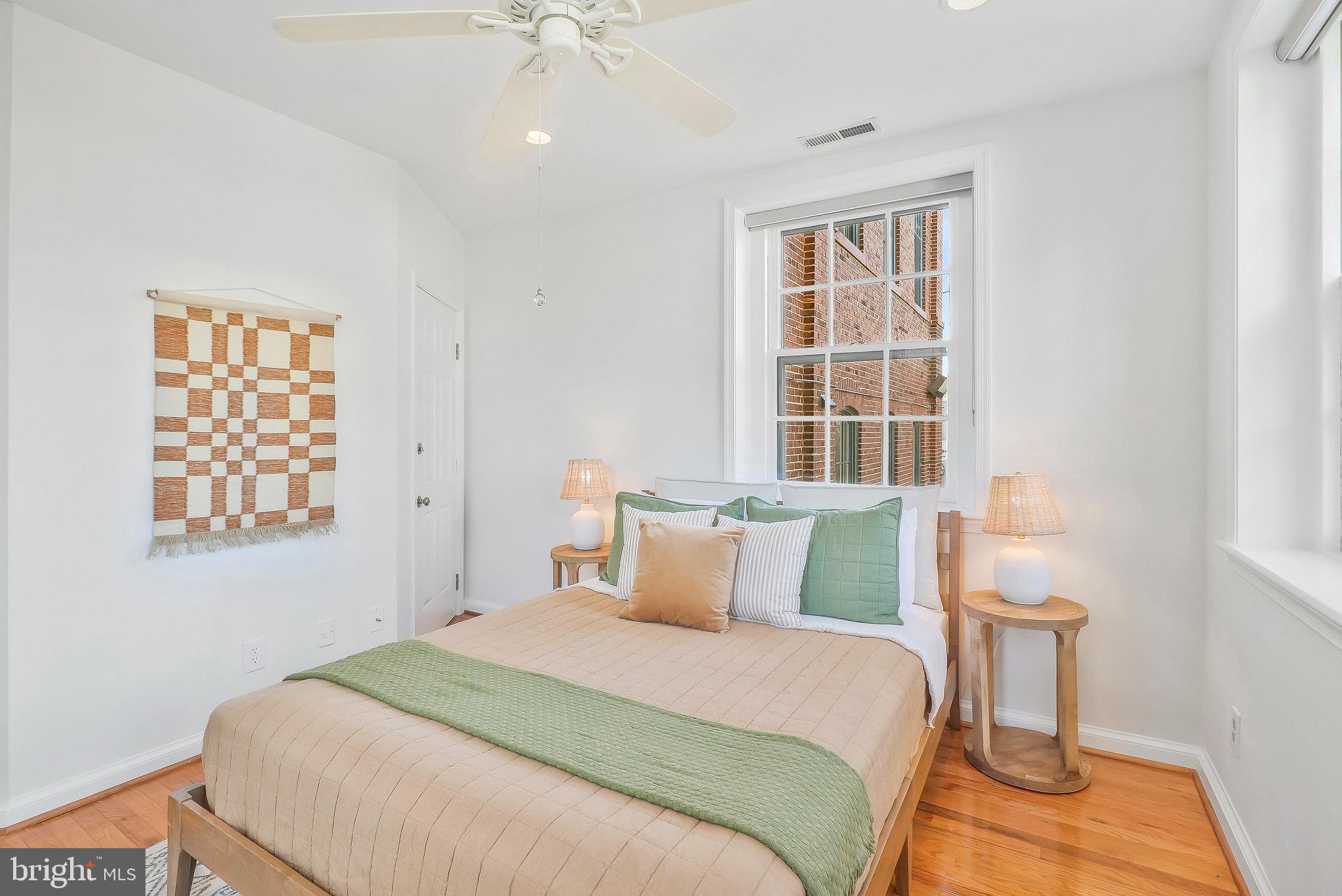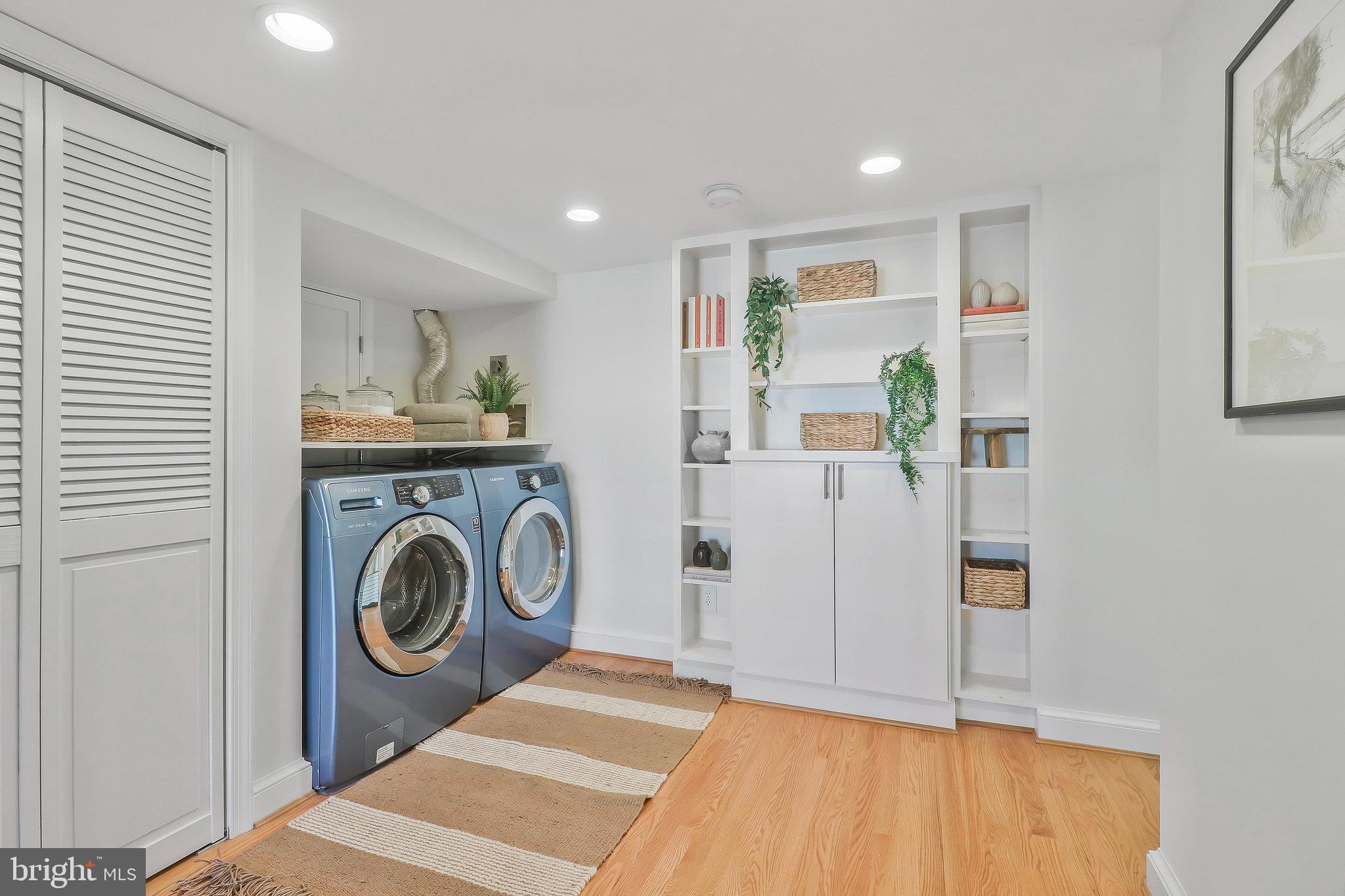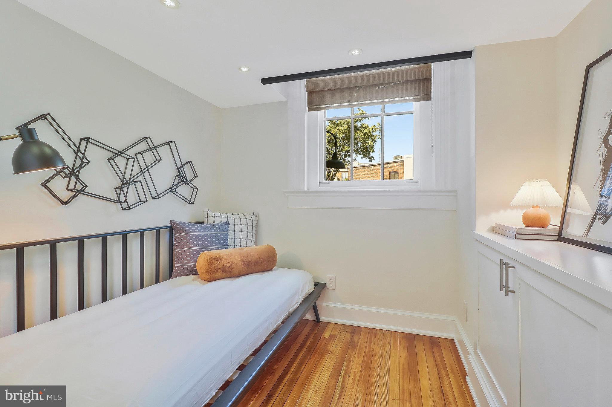 Upstairs is a utilitarian hallway lined with closets galore, a large in-unit laundry area with a washer and dryer, and an area large enough for a work-from-home space. At the end of the hall is the primary BR with large windows overlooking tree-lined and beautiful 5th ST.