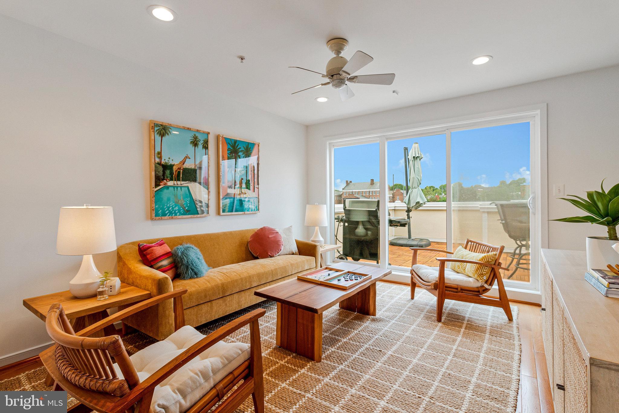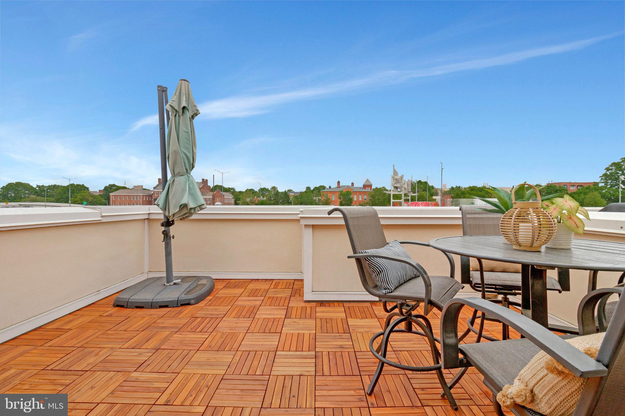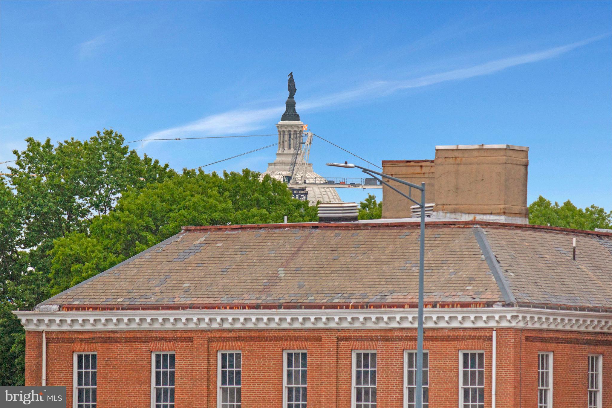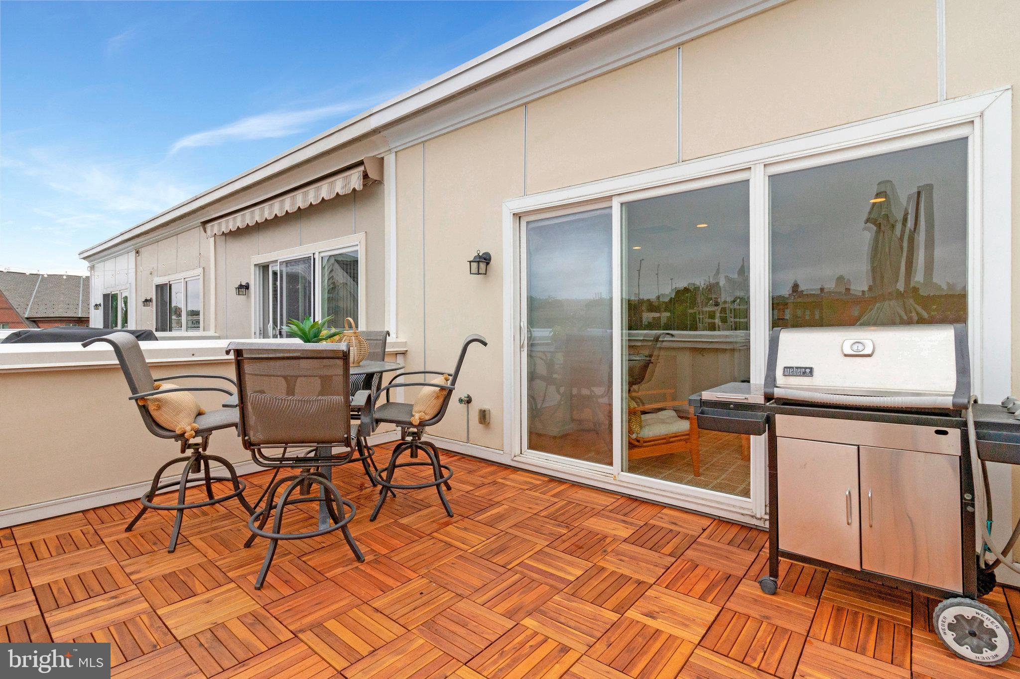 Two bright ensuite bedrooms and bathrooms, plus a hall linen closet and washer/dryer closet are on the 3rd floor. The larger primary bedroom at front easily accommodates a king size bed, has large bay (the perfect peloton perch w/a Capitol view), double closets, plus large bathroom w/double sink vanity, glass stall shower, and another linen closet. An oasis awaits on the north-facing 4th floor where the 3rd ensuite bedroom and bath (great for guests, exercise room, or another office), plus a large bright entertainment room w/sliding glass doors opens onto a spacious roof deck w/Capitol view, providing 3 season enjoyment w/table and chairs, large umbrella and a gas line for gas grill (all convey).