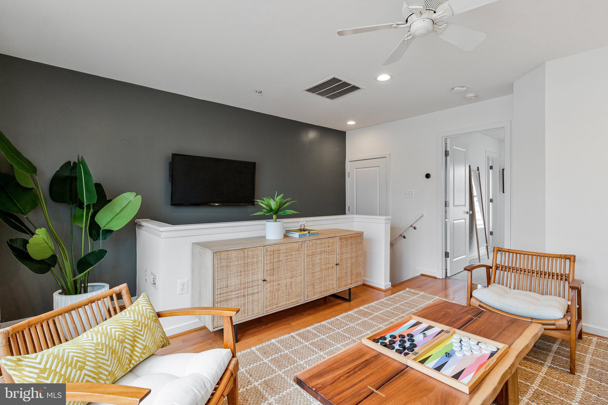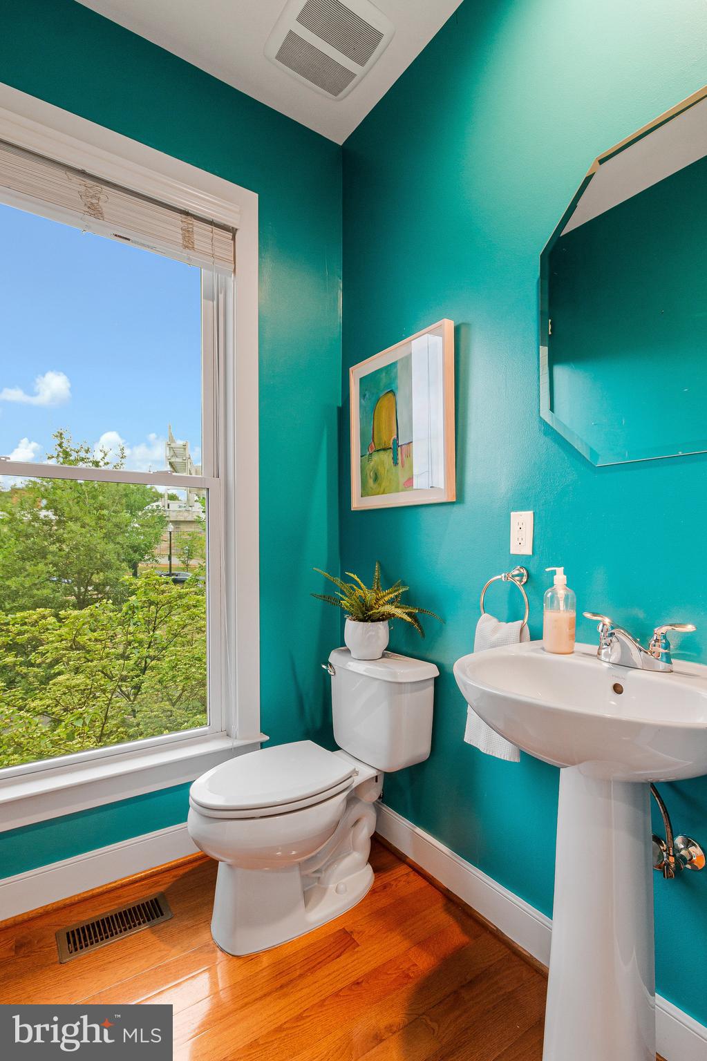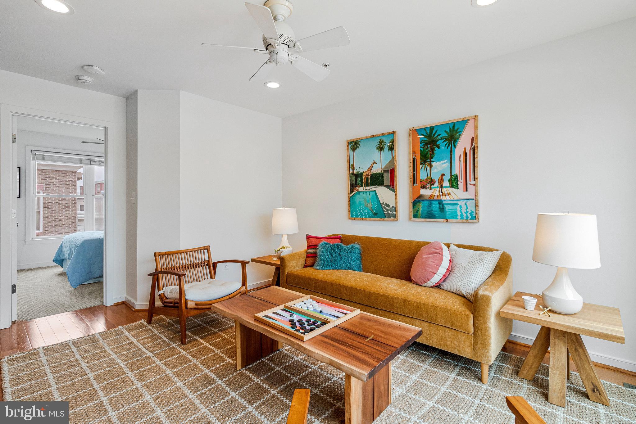 Two bright ensuite bedrooms and bathrooms, plus a hall linen closet and washer/dryer closet are on the 3rd floor. The larger primary bedroom at front easily accommodates a king size bed, has large bay (the perfect peloton perch w/a Capitol view), double closets, plus large bathroom w/double sink vanity, glass stall shower, and another linen closet. An oasis awaits on the north-facing 4th floor where the 3rd ensuite bedroom and bath (great for guests, exercise room, or another office), plus a large bright entertainment room w/sliding glass doors opens onto a spacious roof deck w/Capitol view, providing 3 season enjoyment w/table and chairs, large umbrella and a gas line for gas grill (all convey).