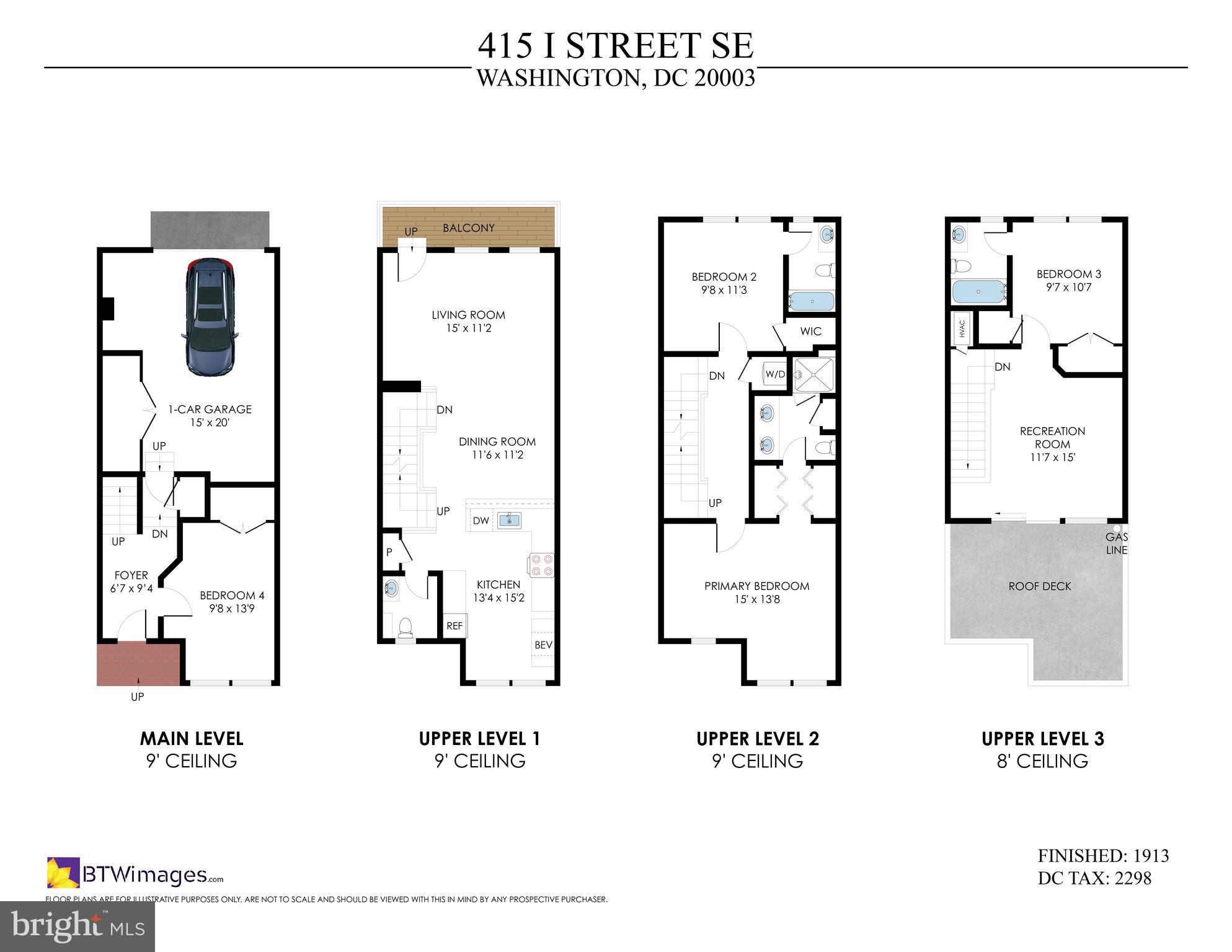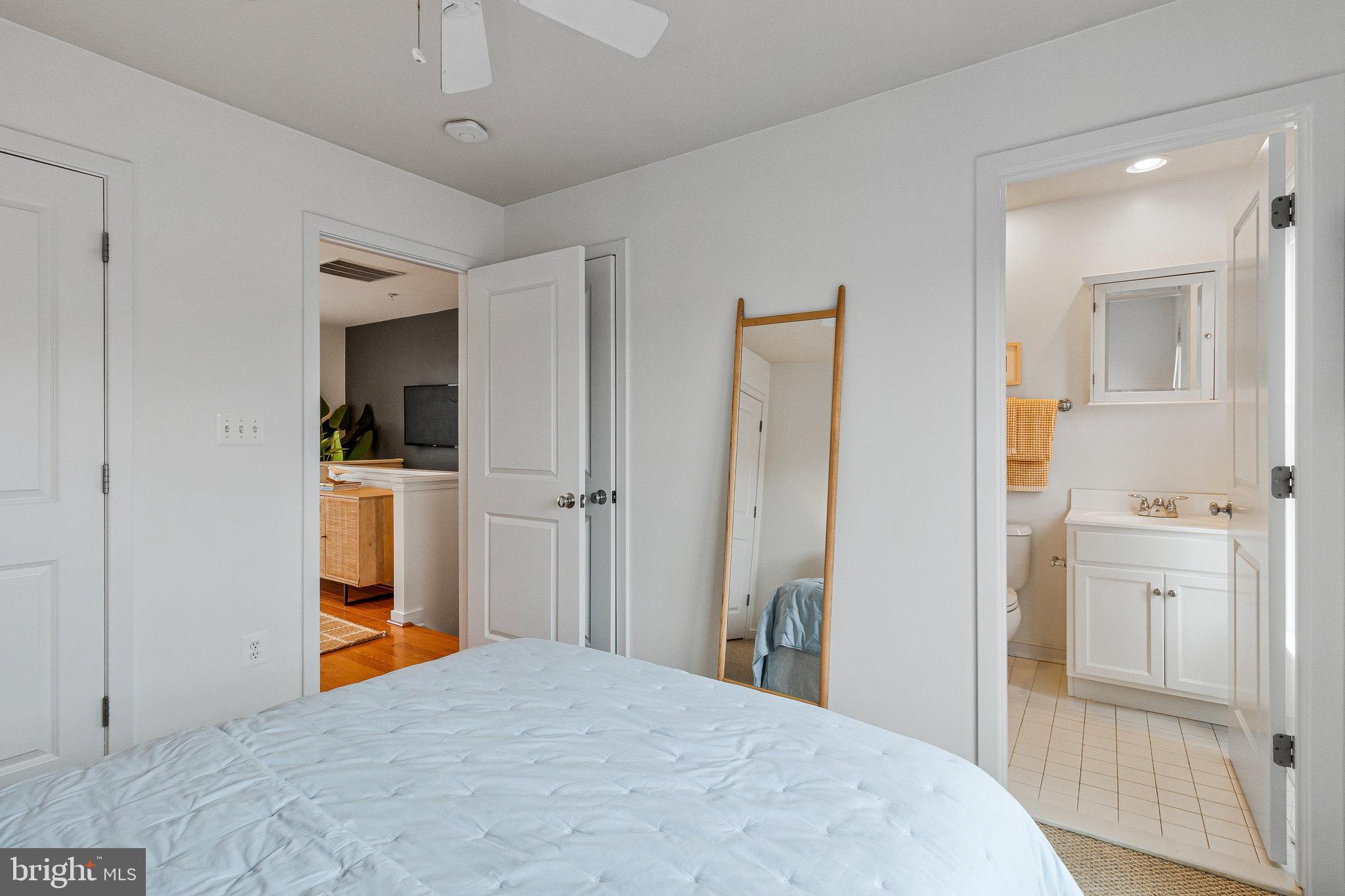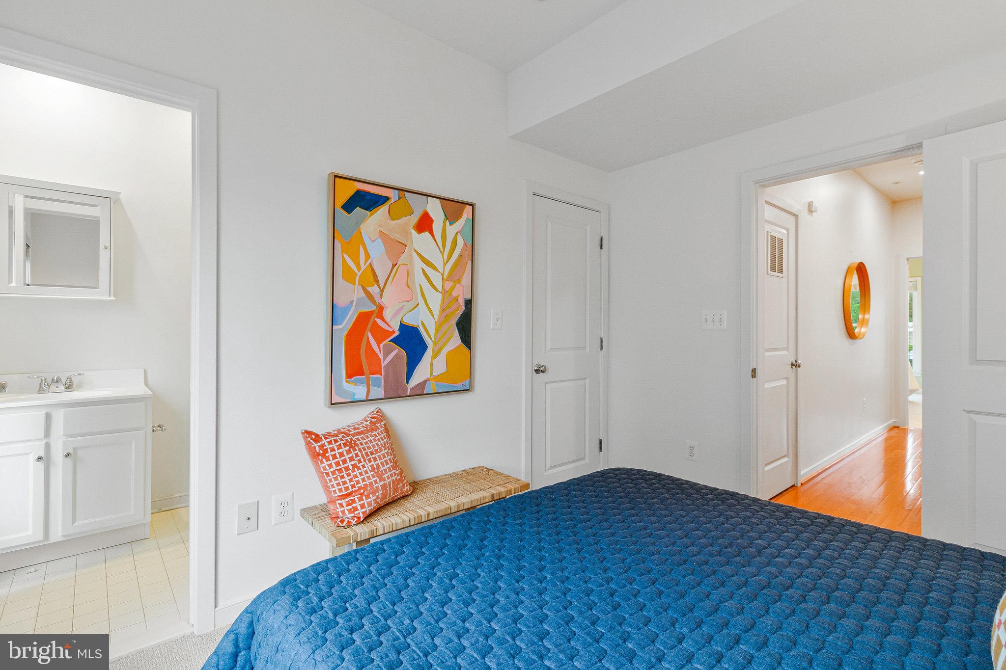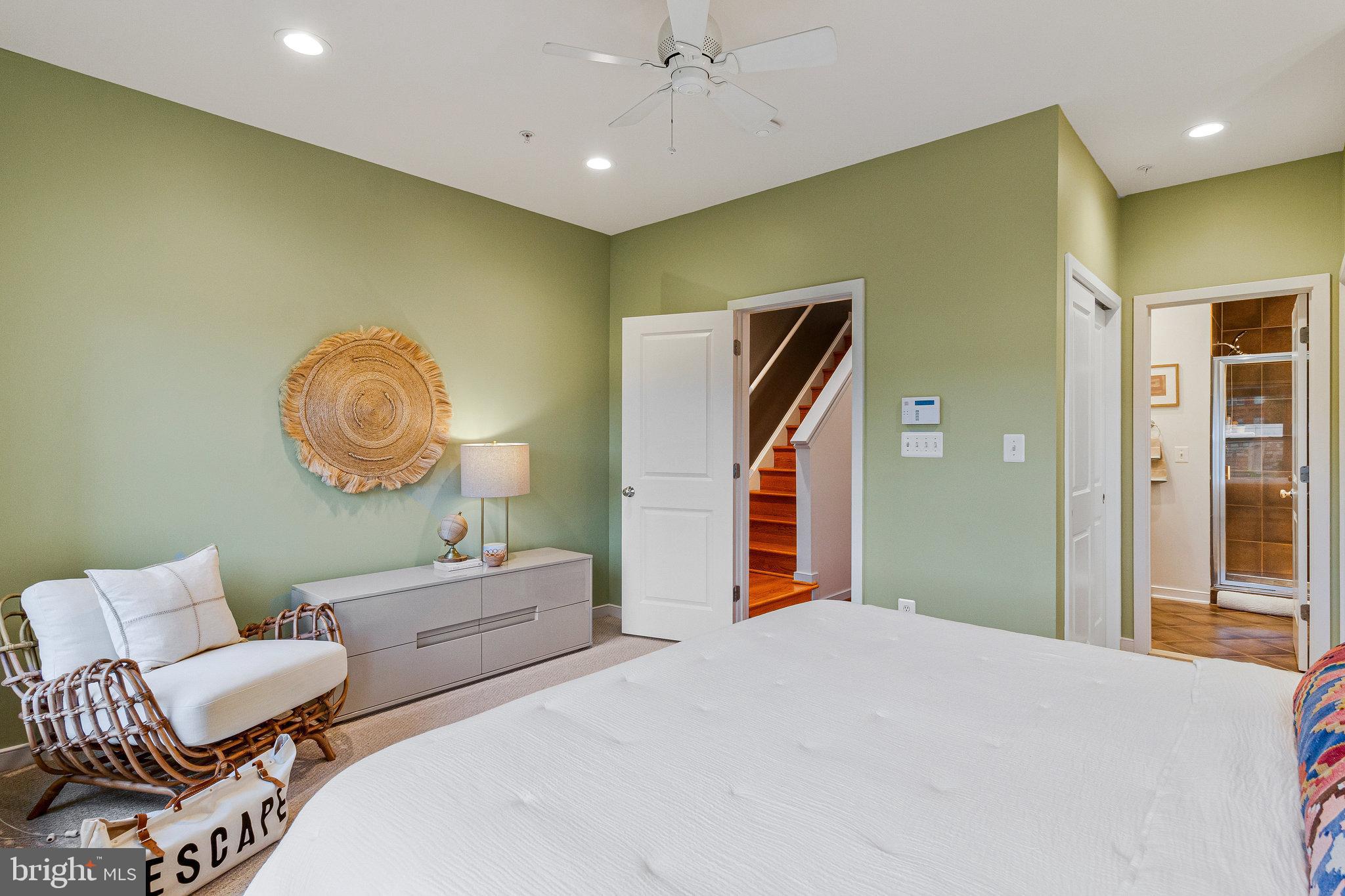 Two bright ensuite bedrooms and bathrooms, plus a hall linen closet and washer/dryer closet are on the 3rd floor. The larger primary bedroom at front easily accommodates a king size bed, has large bay (the perfect peloton perch w/a Capitol view), double closets, plus large bathroom w/double sink vanity, glass stall shower, and another linen closet. An oasis awaits on the north-facing 4th floor where the 3rd ensuite bedroom and bath (great for guests, exercise room, or another office), plus a large bright entertainment room w/sliding glass doors opens onto a spacious roof deck w/Capitol view, providing 3 season enjoyment w/table and chairs, large umbrella and a gas line for gas grill (all convey).