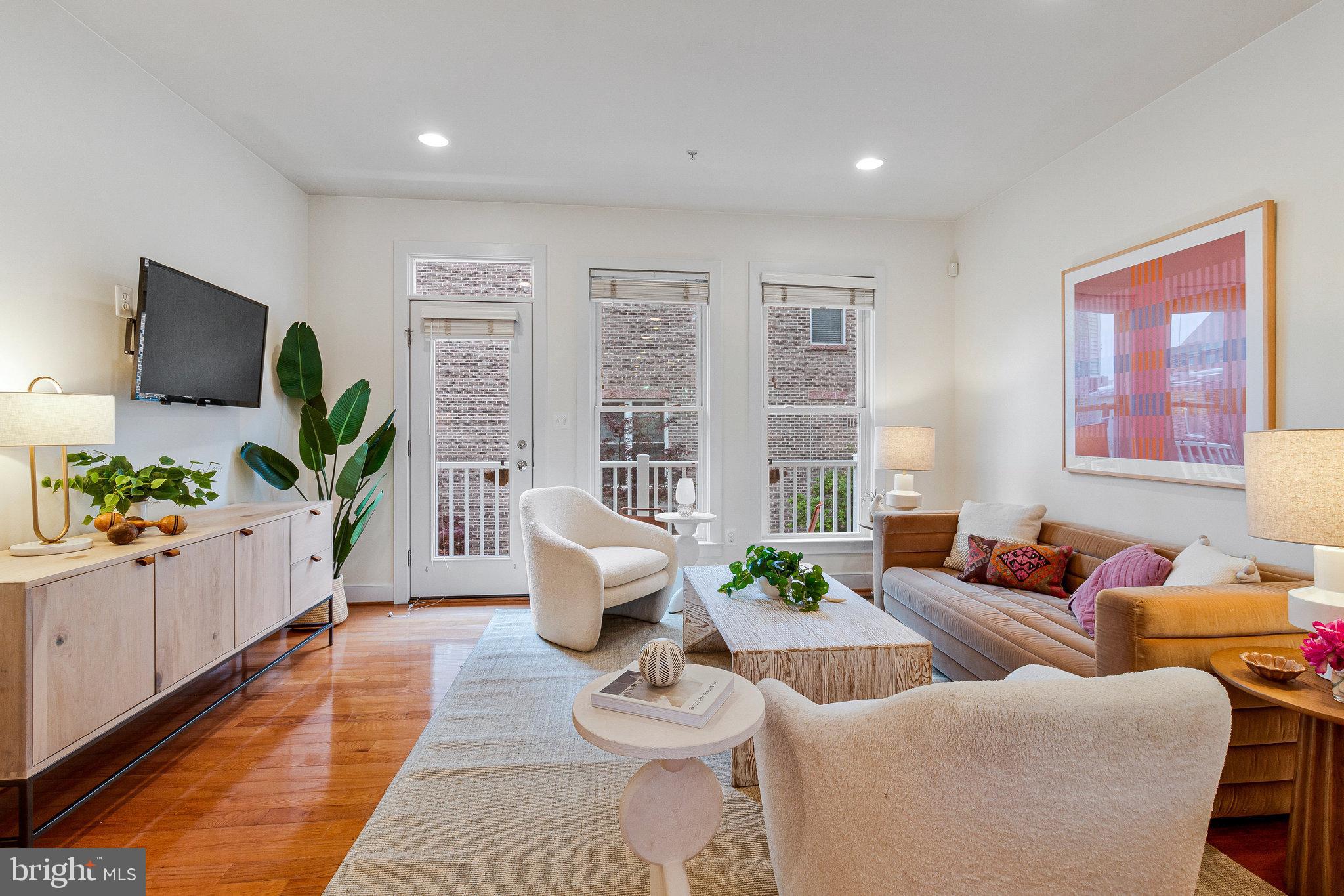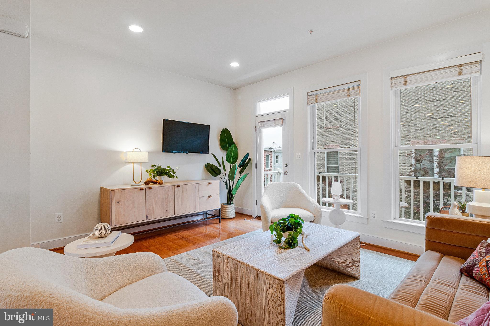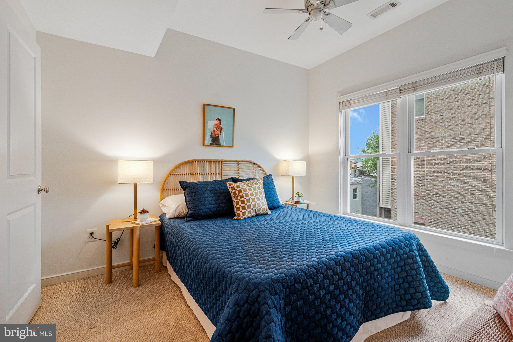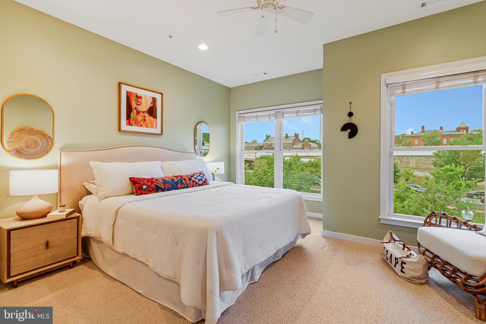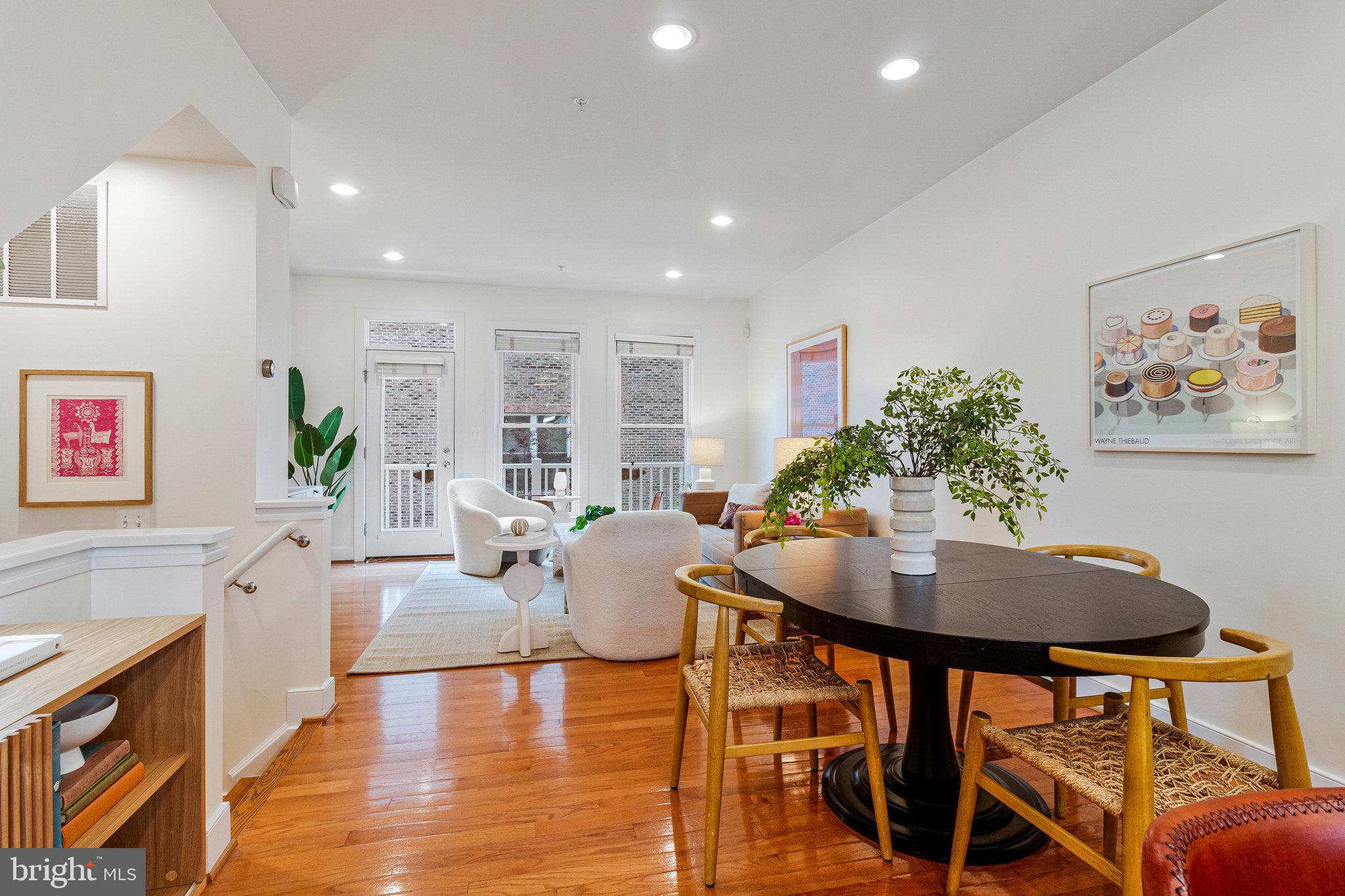 Capitol Quarter 4BR w/2 Capitol views, plus perfect positioning for privacy and light!! Popular Addison model features 4BR/3.5BA (3BRs are ensuite w/private baths), a large bright entertainment room, a roof deck w/a Capitol view, amazing storage, practically sound-proof windows throughout, dual zone HVAC, and garage parking, all in rare PRIMO location looking north onto DEEP and WIDE tree-filled park and bike paths. Flexible floorplan accommodates a variety of uses, as the entry level BR w/huge closet and large windows is an equally ideal WFH office, mini-gym, art or yoga room, and the hall coat closet is convenient from front door or garage. One level up a spacious and bright open plan living/dining/kitchen area w/wood floor is great for entertaining on large or small scale, w/a neat nook for a credenza or bar cart across from your dining table, plenty of space for large couches in the living area, and the convenience of a discreetly-located powder room. At rear, the wall of windows opens onto a south-facing balcony to enjoy morning coffee or chat w/neighbors and the secret screen door is a nice bonus. Oversize windows at the front provide great light and a view of the park from the kitchen. Cooks who entertain will love this large and well-designed space, w/breakfast bar, gas cooking, microwave, new dishwasher (2024), tall cabinets, copious granite countertops, plus a bonus butcher block credenza (wine fridge as is), and a separate pantry closet.