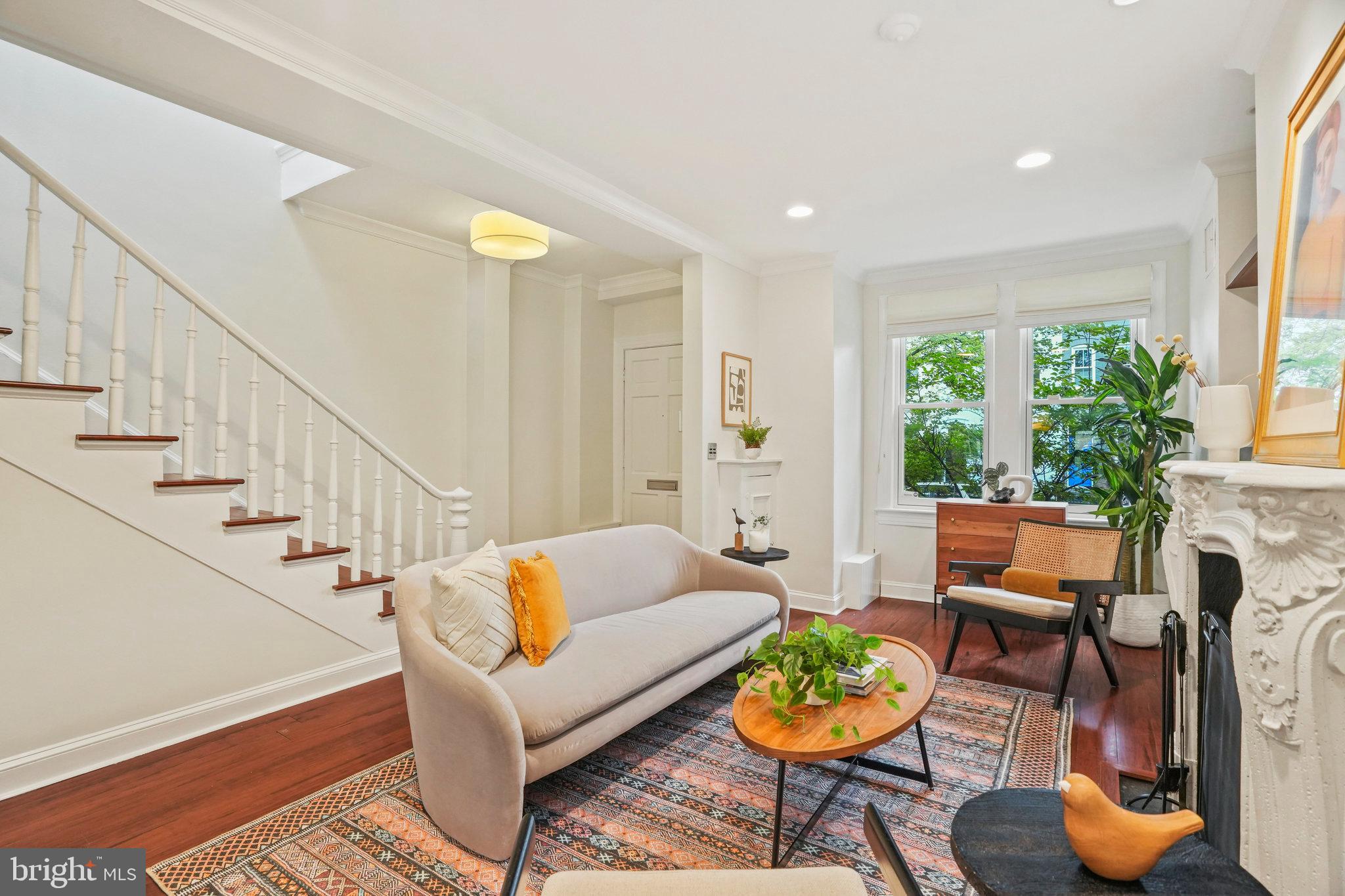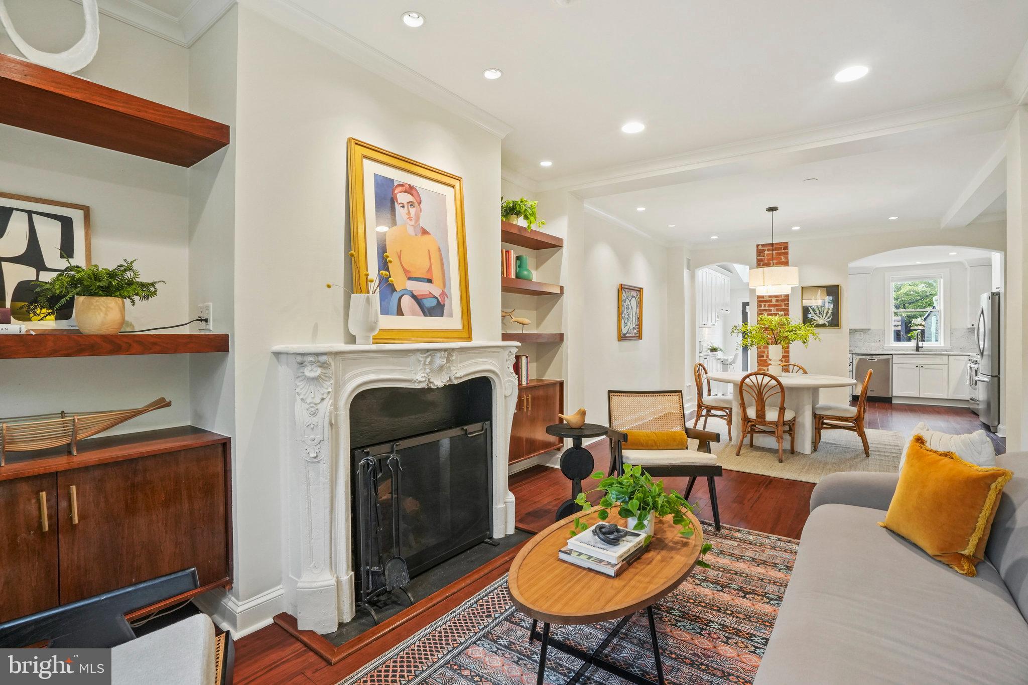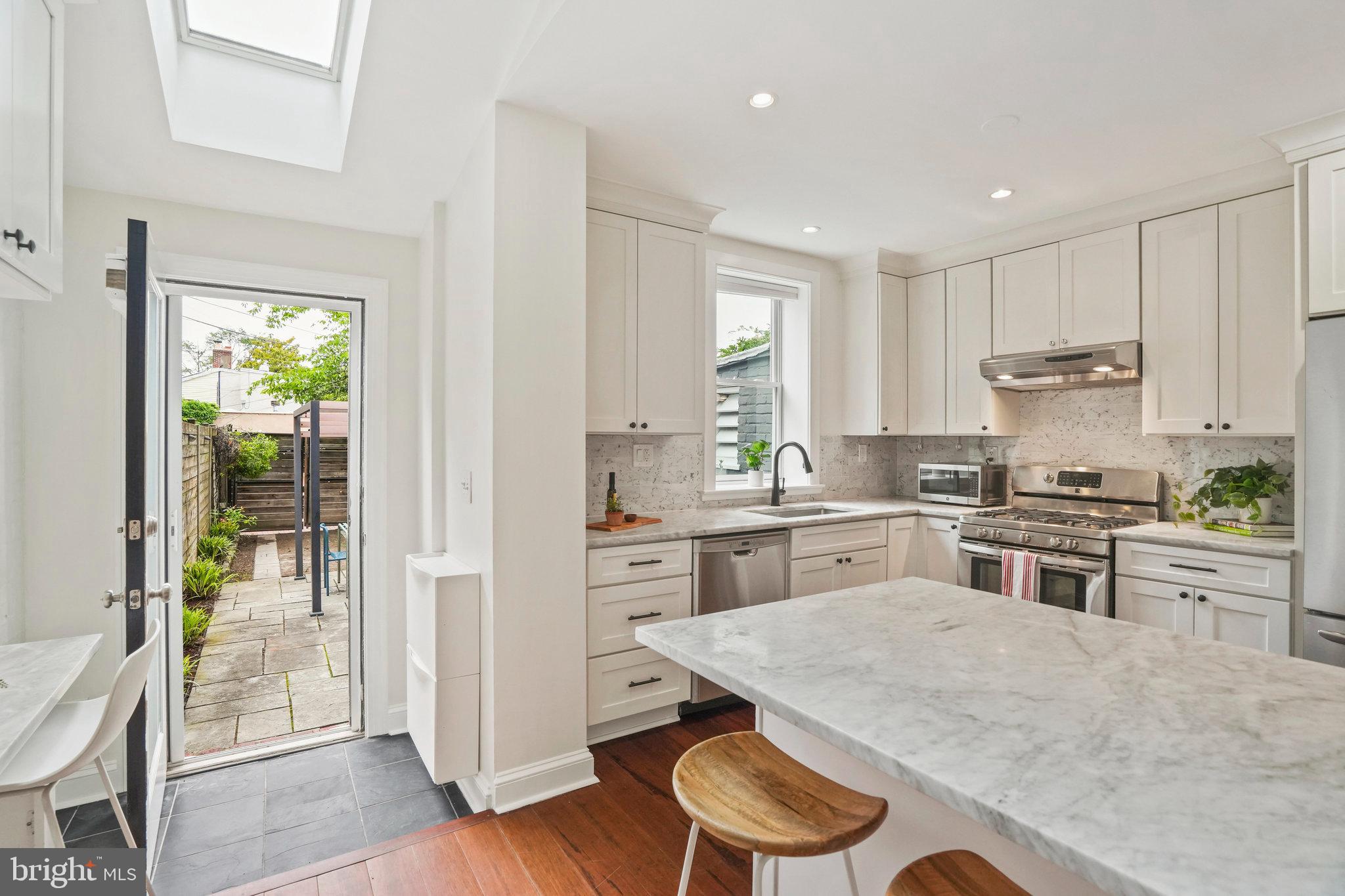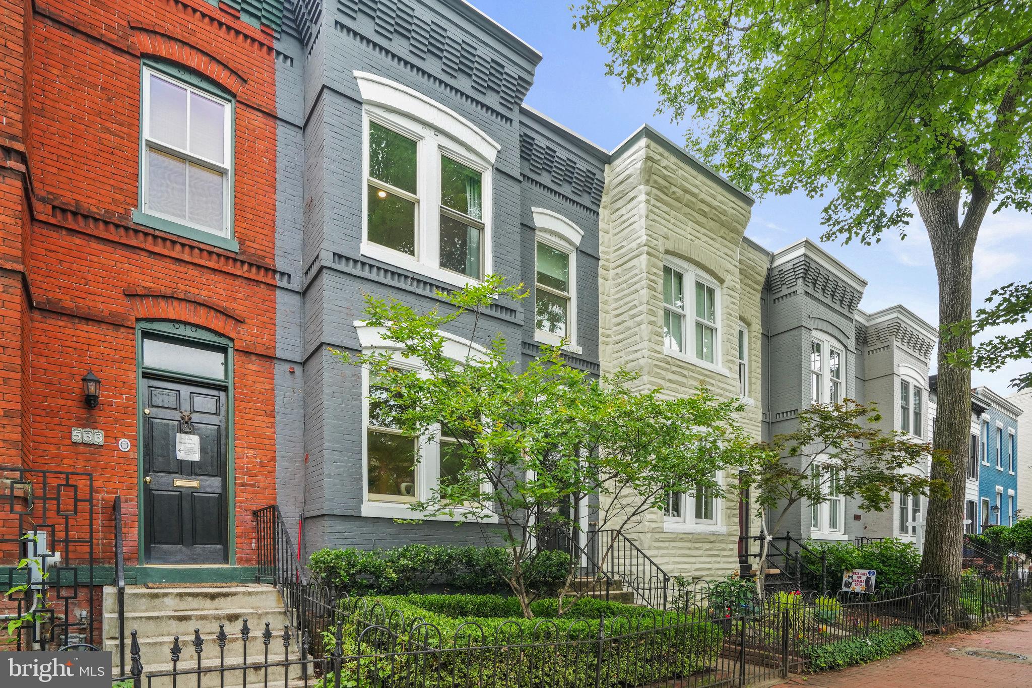Welcome to this charming townhouse at 531 10th Street SE, located on arguably one of the most vibrant blocks of Capitol Hill. This elegant residence features 3 bedrooms , 1.5 baths, and off-street PARKING, offering a harmonious blend of historical charm and modern convenience. As you step inside, you are greeted by the open Living Area adorned with Brazilian hardwood floors, a Wood-burning Fireplace with original mantle, and built-in shelving. The separate Dining Room and a convenient Powder Room further enhance the main level's appeal. The wide, bright Kitchen boasts two skylights, immaculate white cabinetry (great storage!), a marble subway tile backsplash, stainless steel appliances, and a spacious marble breakfast island.