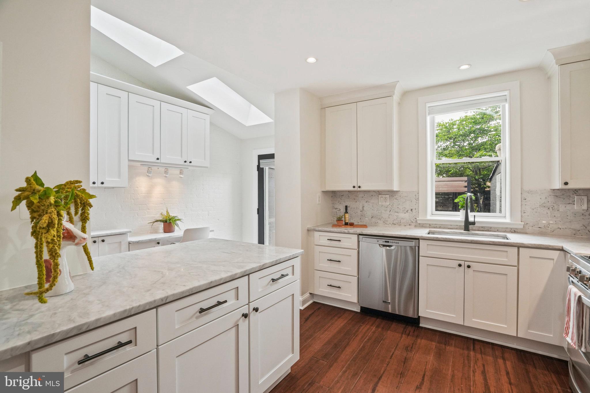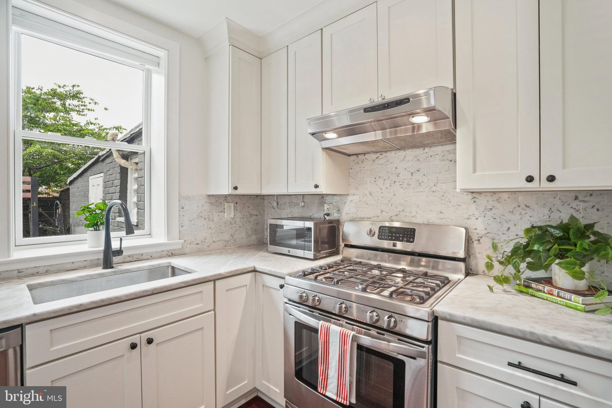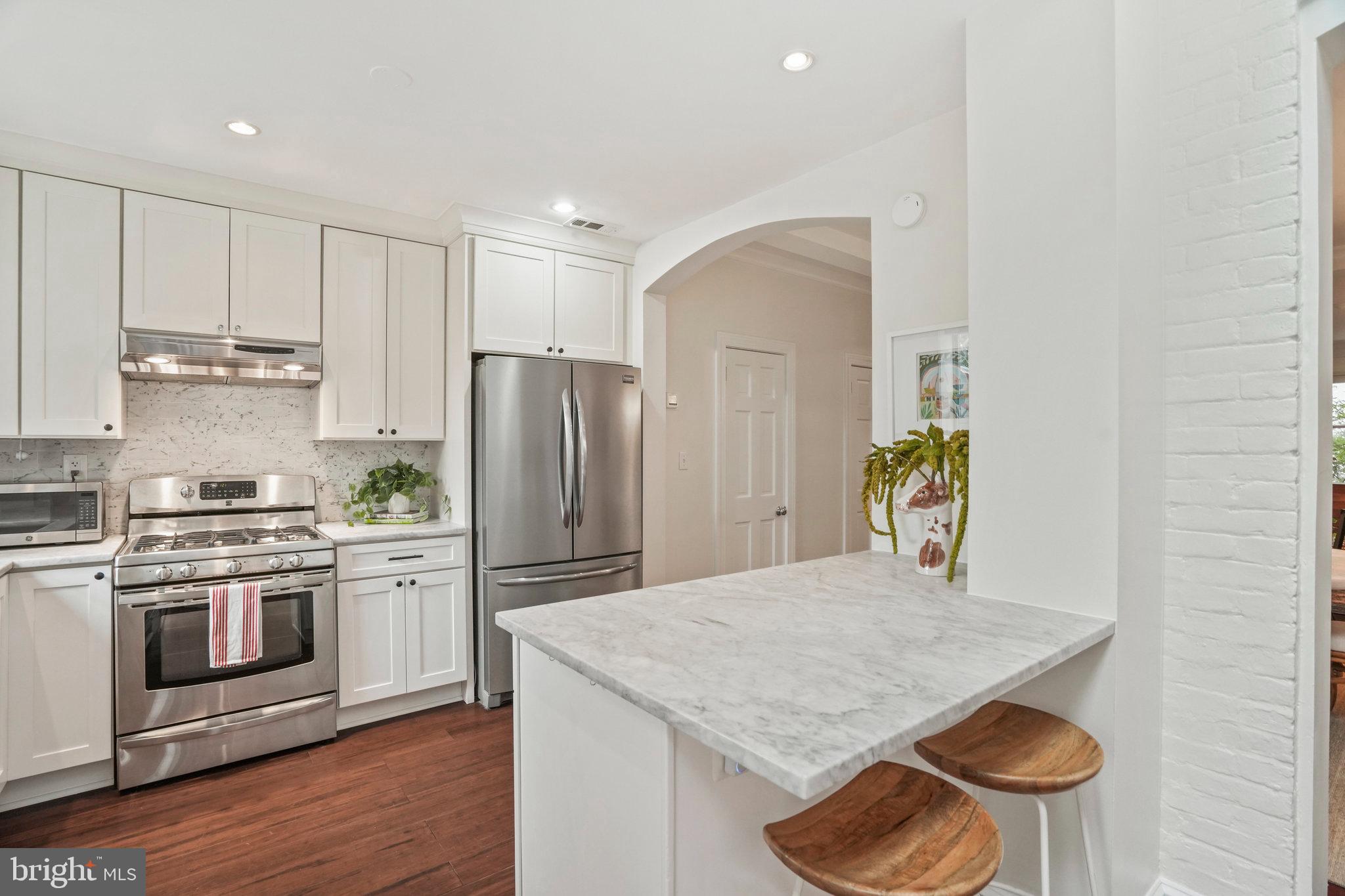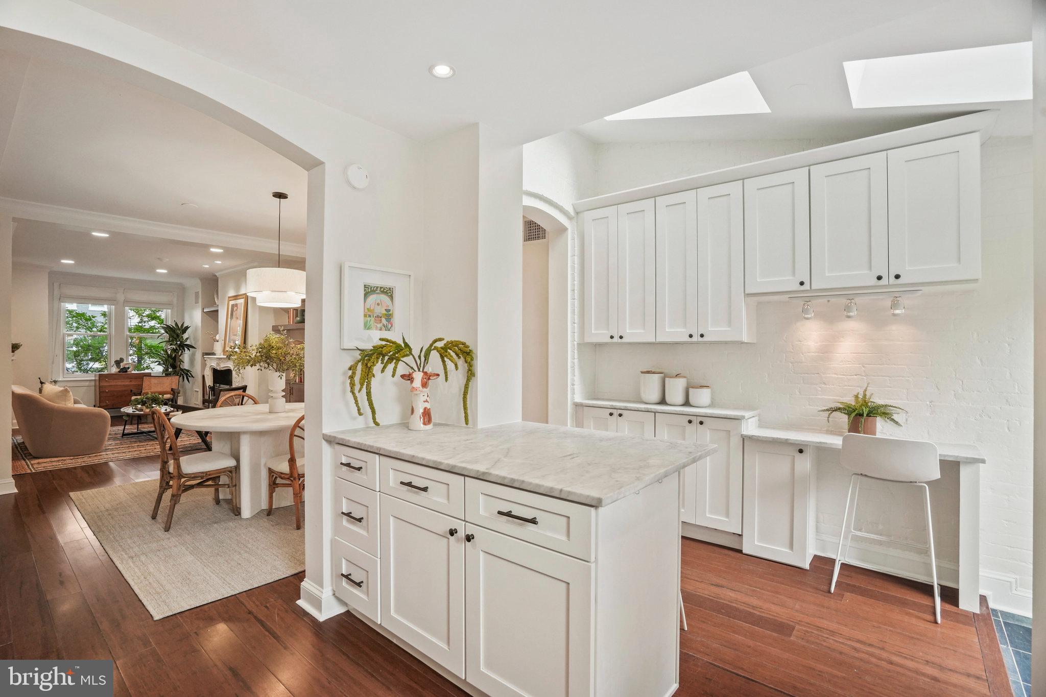 Welcome to this charming townhouse at 531 10th Street SE, located on arguably one of the most vibrant blocks of Capitol Hill. This elegant residence features 3 bedrooms , 1.5 baths, and off-street PARKING, offering a harmonious blend of historical charm and modern convenience. As you step inside, you are greeted by the open Living Area adorned with Brazilian hardwood floors, a Wood-burning Fireplace with original mantle, and built-in shelving. The separate Dining Room and a convenient Powder Room further enhance the main level's appeal. The wide, bright Kitchen boasts two skylights, immaculate white cabinetry (great storage!), a marble subway tile backsplash, stainless steel appliances, and a spacious marble breakfast island.