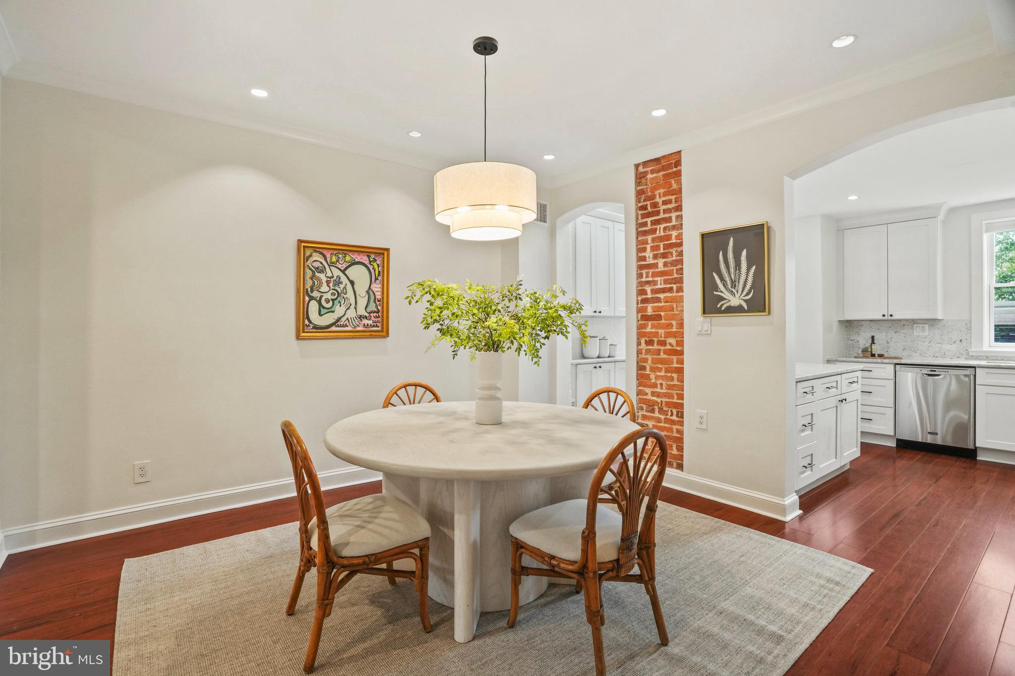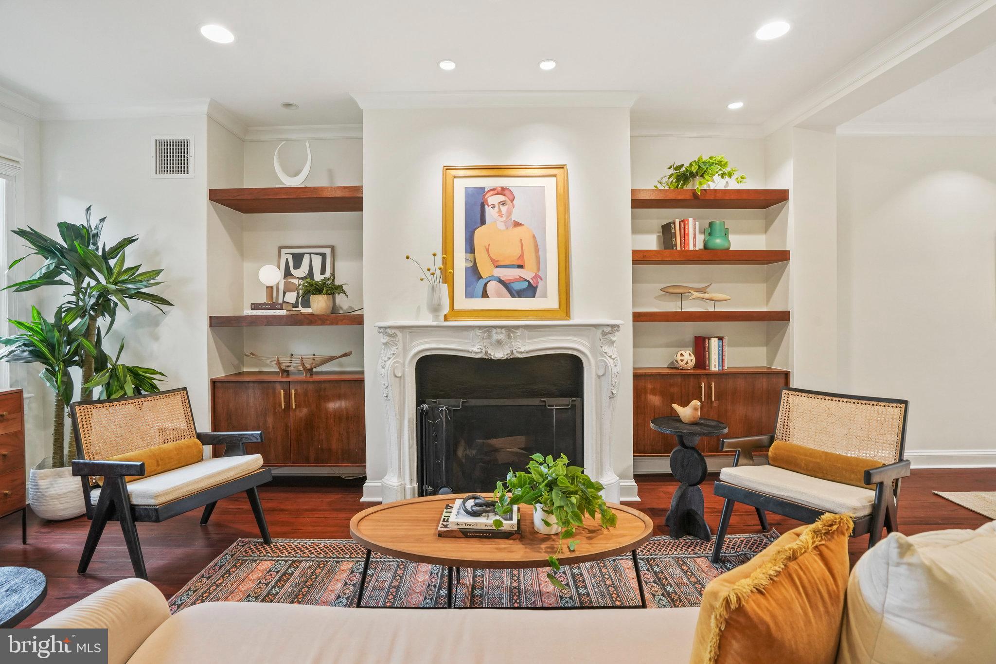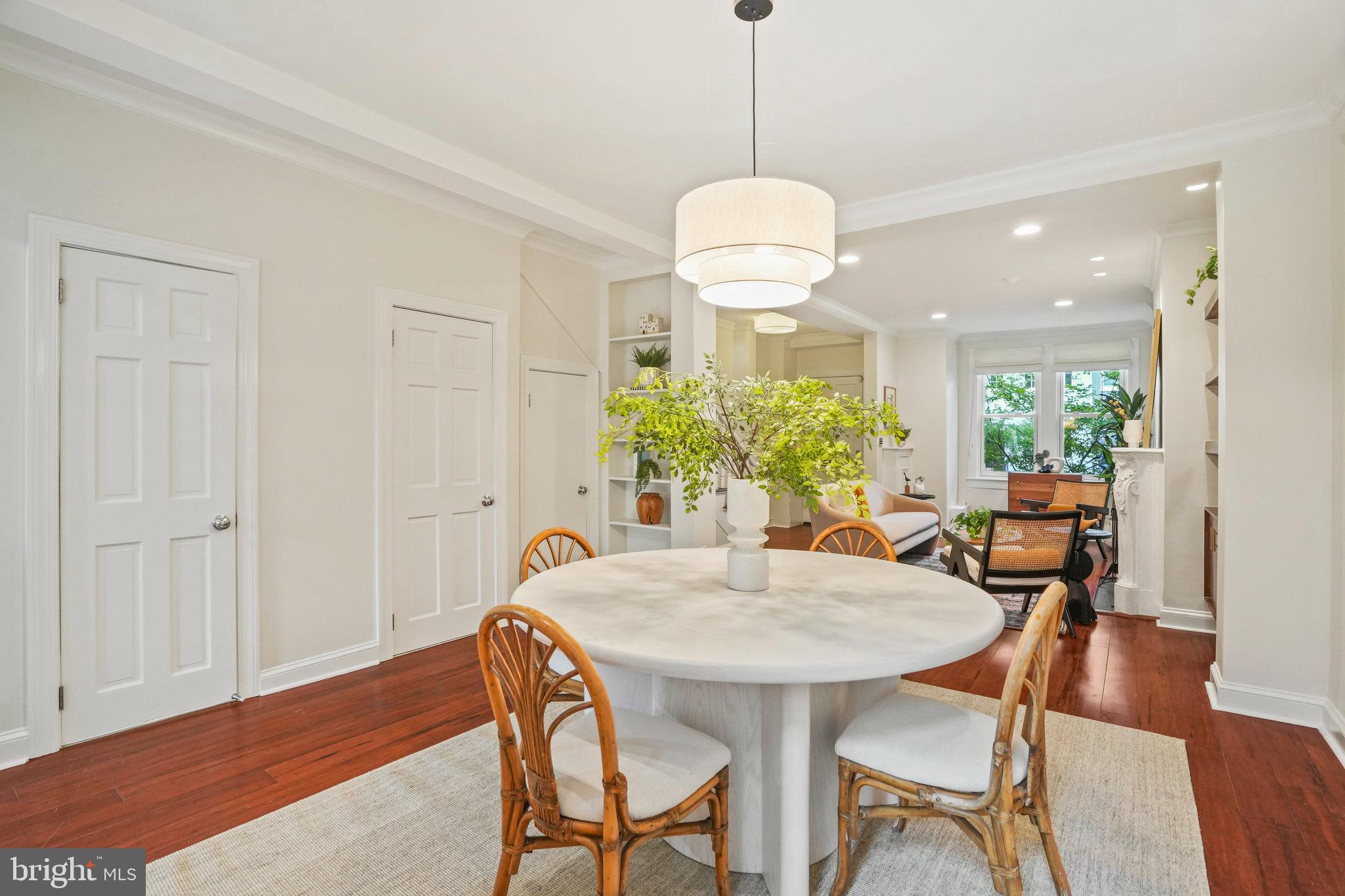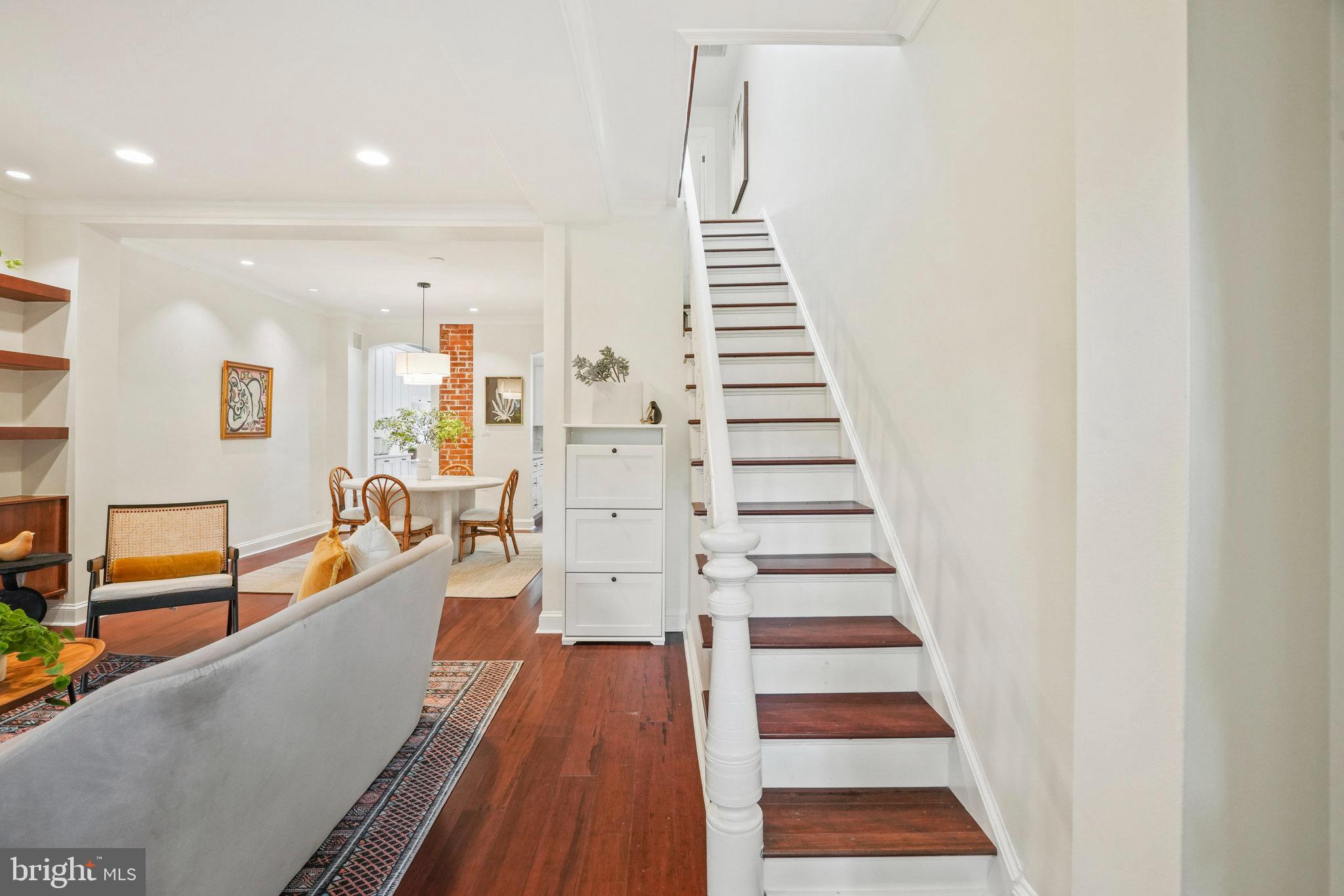 Welcome to this charming townhouse at 531 10th Street SE, located on arguably one of the most vibrant blocks of Capitol Hill. This elegant residence features 3 bedrooms , 1.5 baths, and off-street PARKING, offering a harmonious blend of historical charm and modern convenience. As you step inside, you are greeted by the open Living Area adorned with Brazilian hardwood floors, a Wood-burning Fireplace with original mantle, and built-in shelving. The separate Dining Room and a convenient Powder Room further enhance the main level's appeal. The wide, bright Kitchen boasts two skylights, immaculate white cabinetry (great storage!), a marble subway tile backsplash, stainless steel appliances, and a spacious marble breakfast island.