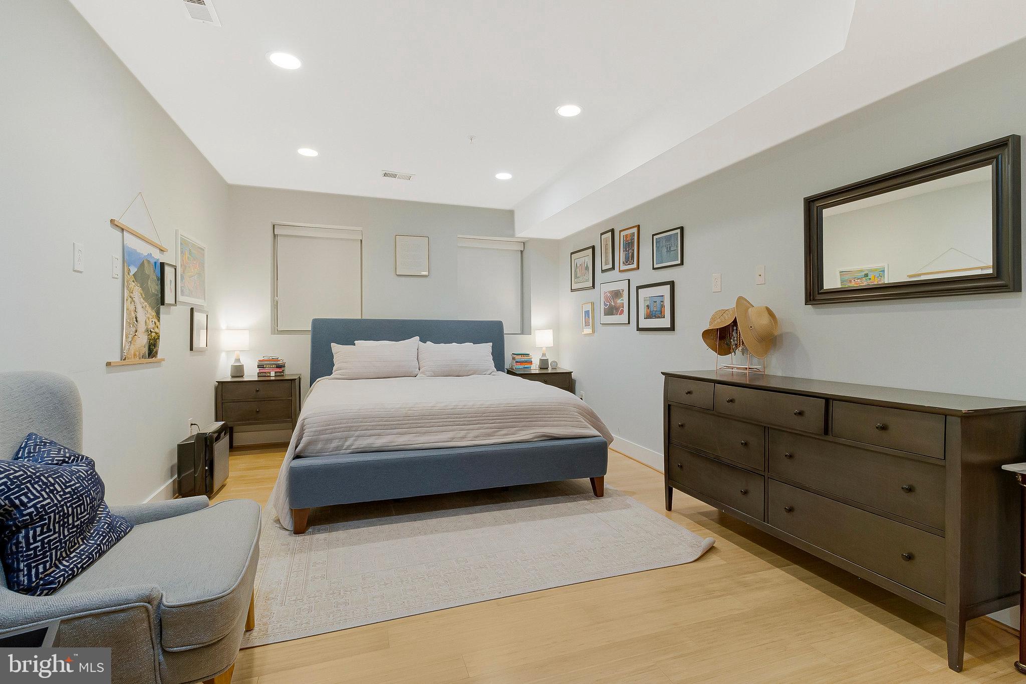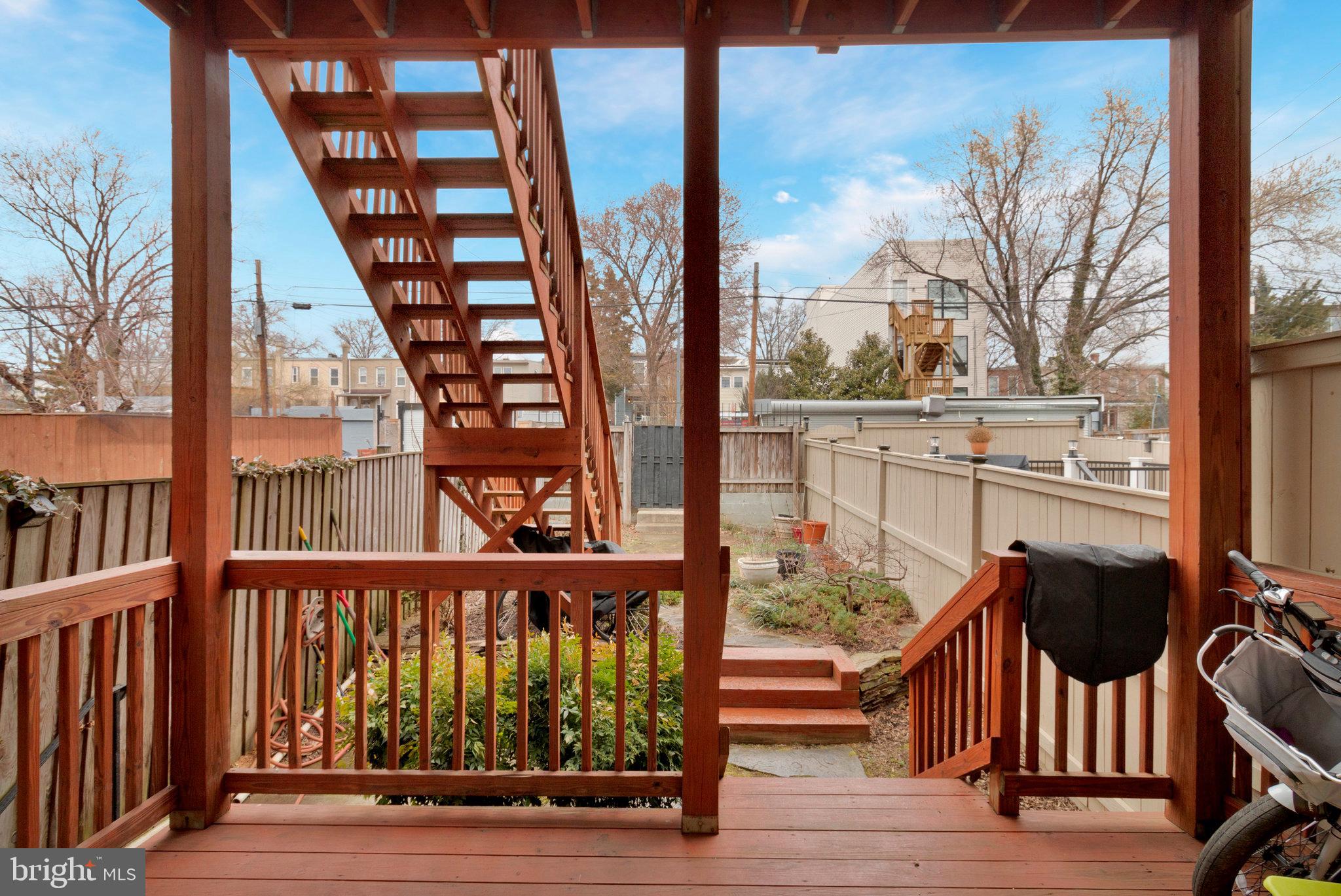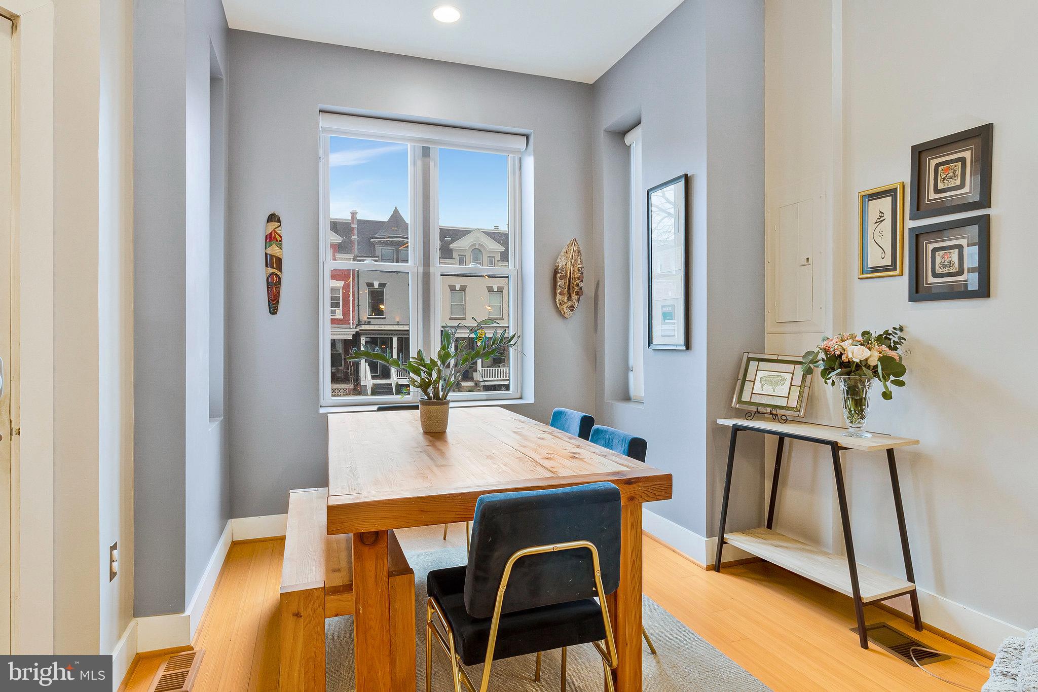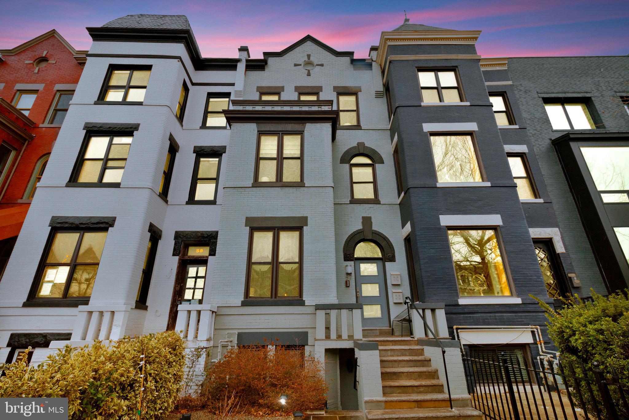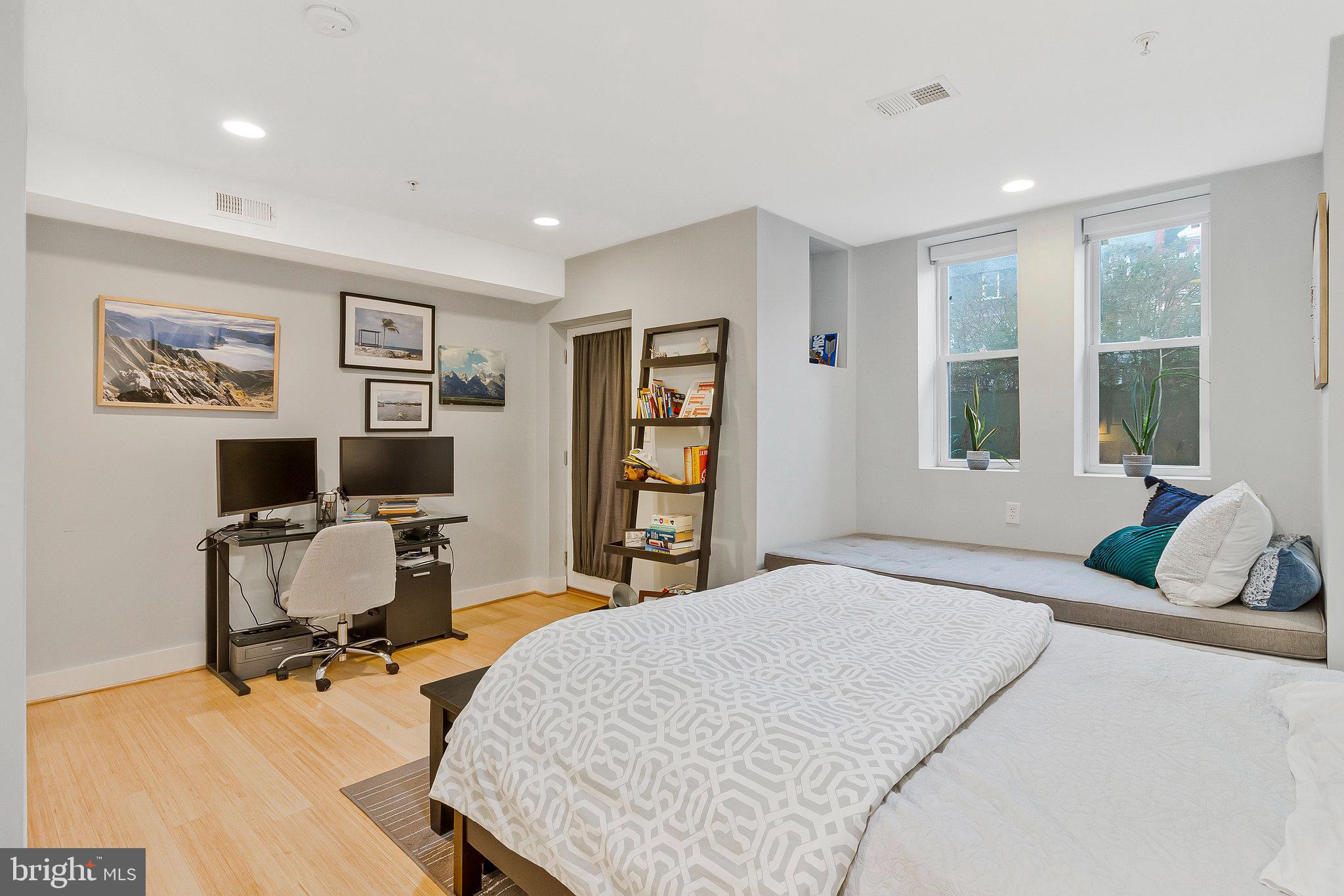 We invite you to explore 57 Bryant St NW #1, a spacious two-level condo with PARKING located in Bloomingdale, adjacent to the exciting upcoming developments at the McMillan Reservoir. This home welcomes you with its high ceilings and warm wood floors, creating a versatile living area that accommodates various furniture arrangements. The front bay area makes for a bright dining space, surrounded by windows on three sides. The kitchen, designed in a U-shape, features island seating, stylish cabinetry, marble countertops, a pantry closet and stainless steel appliances. Down the hall, a third bedroom offers flexible use as an office, guest room, or additional sleeping space. In the hallway, you'll find a charming full bath with limestone finishes and a glass-paneled shower. On the lower level, two generously sized bedrooms with en-suite baths are positioned on opposite sides of the home. The front primary bedroom boasts a cozy window reading nook, a double closet, and access to the front of the property. The rear hosts a spacious guest bedroom with a walk-in closet and bathroom with tub. Outside, the back porch provides ample space for bike storage and outdoor dining, leading to a beautifully landscaped yard with secure private parking. Just a short walk away, the developing McMillan Reservoir Campus offers an aquatic recreation center with a pool, and future plans include grocery and dining options, as well as abundant green spaces. If you're looking for a condo with low fees that feels as spacious as a house, we encourage you to visit soon and experience this charming piece of Bloomingdale.