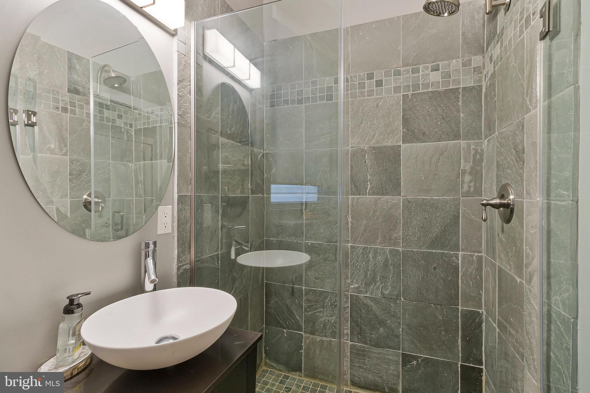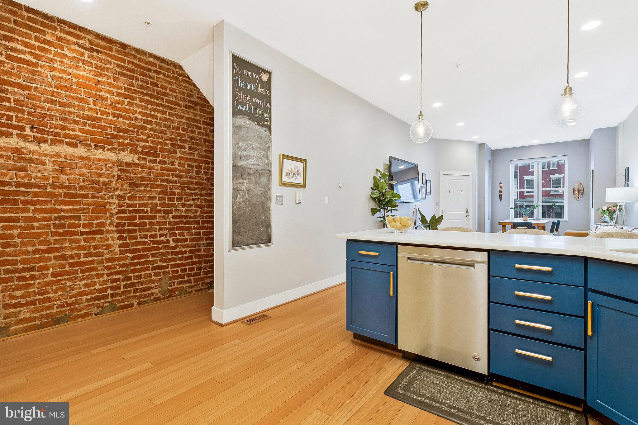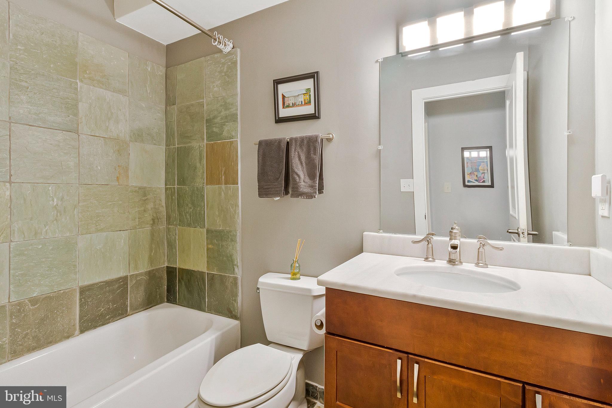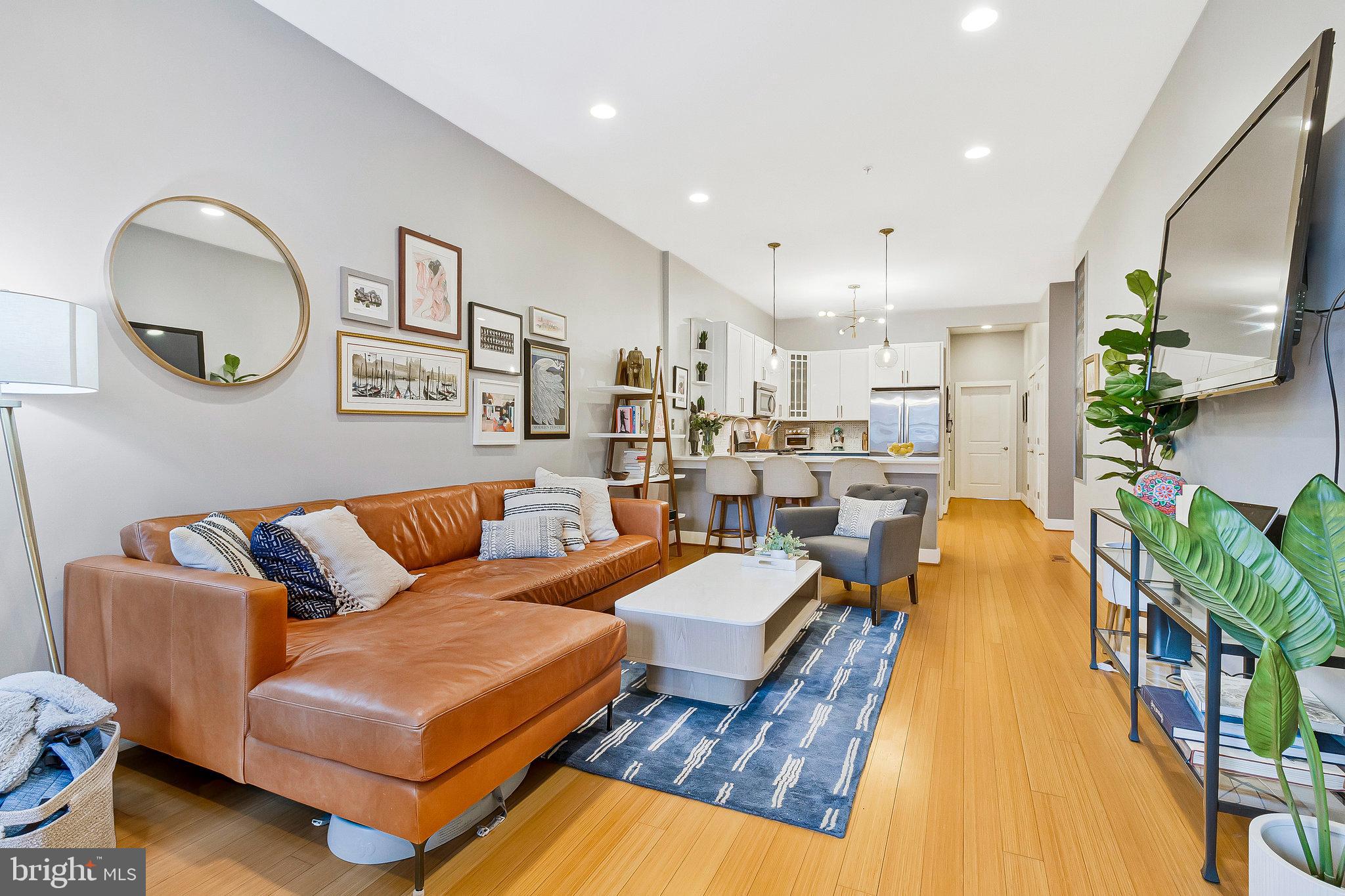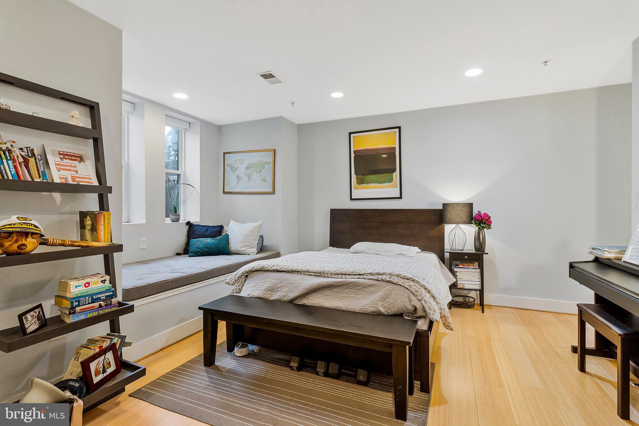 We invite you to explore 57 Bryant St NW #1, a spacious two-level condo with PARKING located in Bloomingdale, adjacent to the exciting upcoming developments at the McMillan Reservoir. This home welcomes you with its high ceilings and warm wood floors, creating a versatile living area that accommodates various furniture arrangements. The front bay area makes for a bright dining space, surrounded by windows on three sides. The kitchen, designed in a U-shape, features island seating, stylish cabinetry, marble countertops, a pantry closet and stainless steel appliances. Down the hall, a third bedroom offers flexible use as an office, guest room, or additional sleeping space. In the hallway, you'll find a charming full bath with limestone finishes and a glass-paneled shower. On the lower level, two generously sized bedrooms with en-suite baths are positioned on opposite sides of the home. The front primary bedroom boasts a cozy window reading nook, a double closet, and access to the front of the property. The rear hosts a spacious guest bedroom with a walk-in closet and bathroom with tub. Outside, the back porch provides ample space for bike storage and outdoor dining, leading to a beautifully landscaped yard with secure private parking. Just a short walk away, the developing McMillan Reservoir Campus offers an aquatic recreation center with a pool, and future plans include grocery and dining options, as well as abundant green spaces. If you're looking for a condo with low fees that feels as spacious as a house, we encourage you to visit soon and experience this charming piece of Bloomingdale.