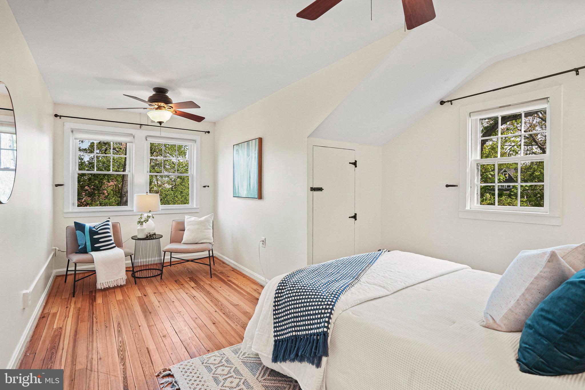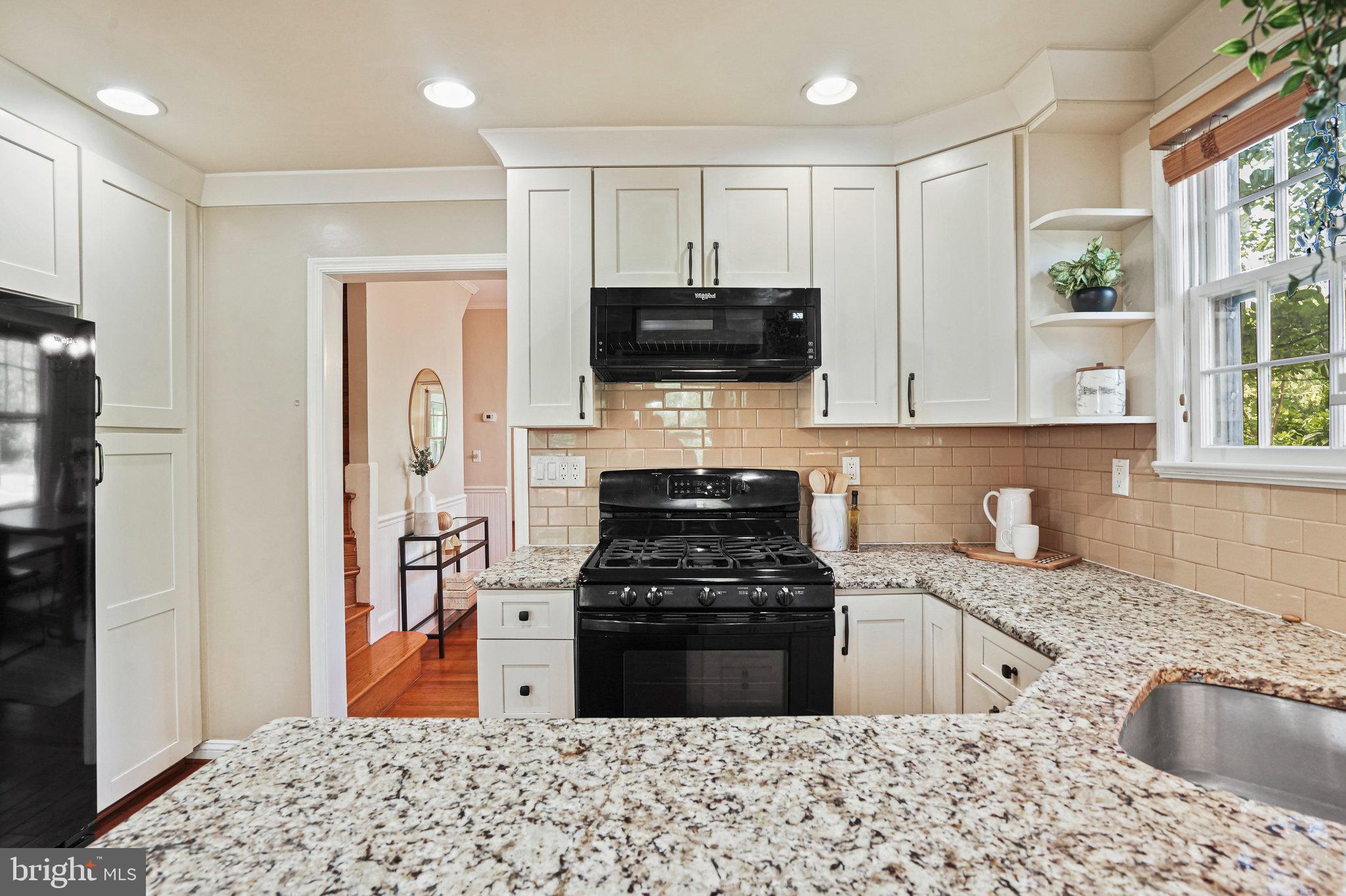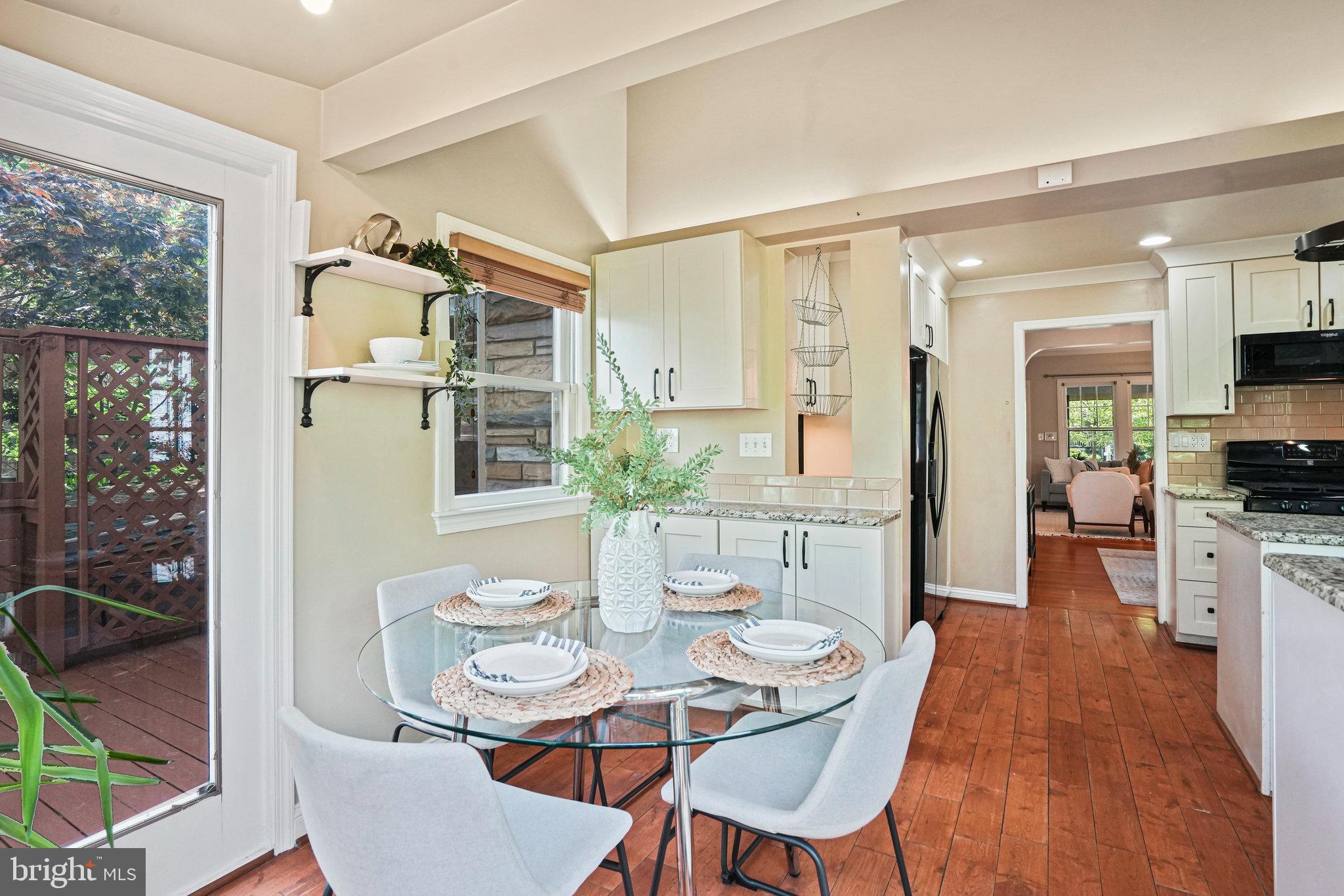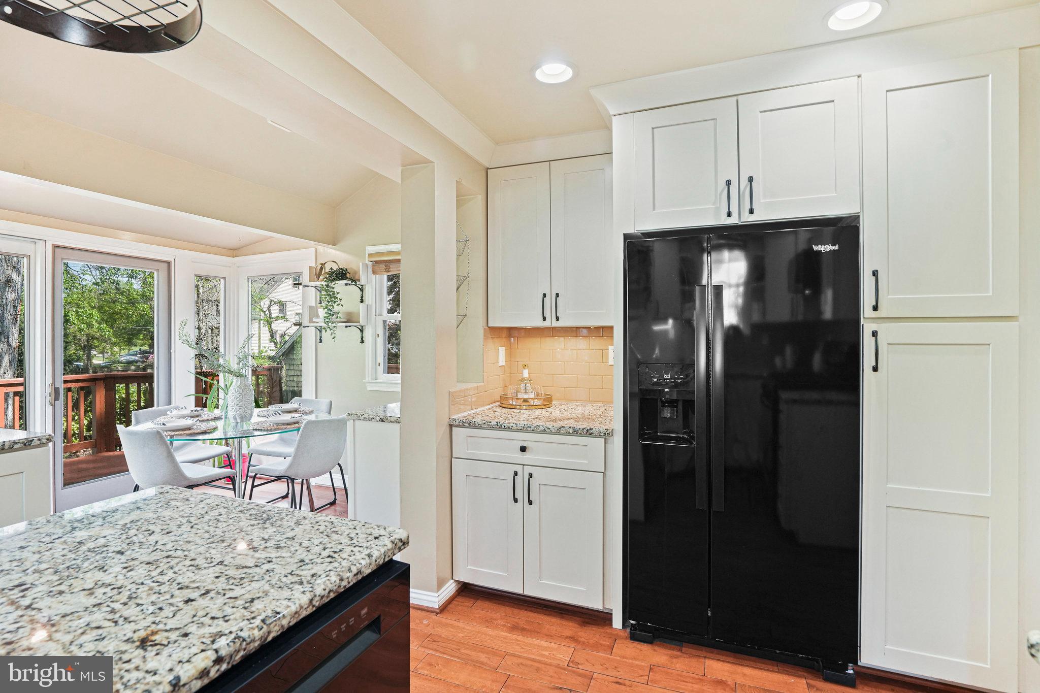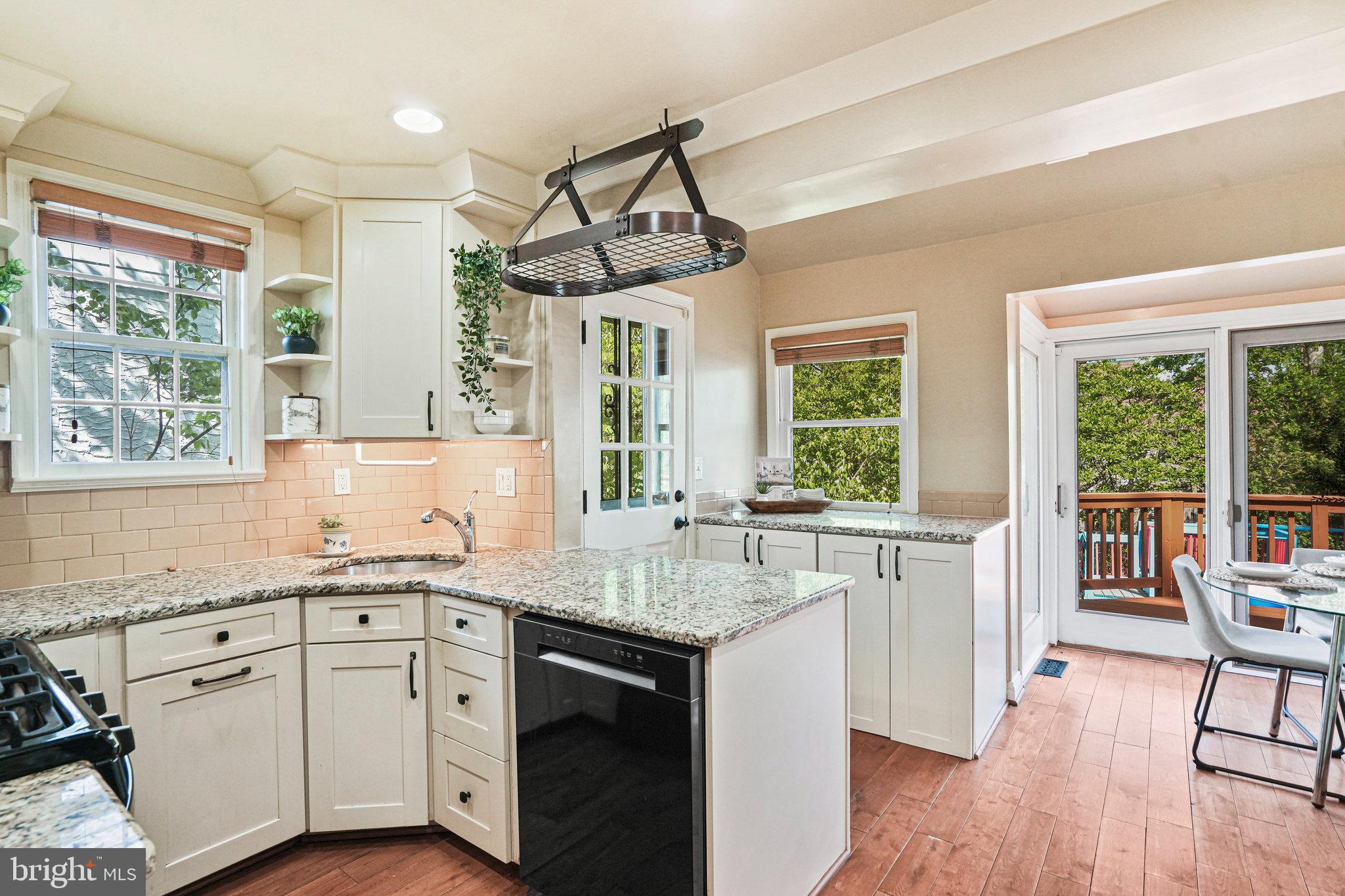 The kitchen is a bright and cheerful space featuring large windows, high ceilings, nearly new appliances, and stone countertops. A cute dining nook at the back offers views through French doors to the green backyard and deck. A first-floor bedroom and updated full bathroom provides privacy- ideal for guests, office or those preferring no-stairs living.