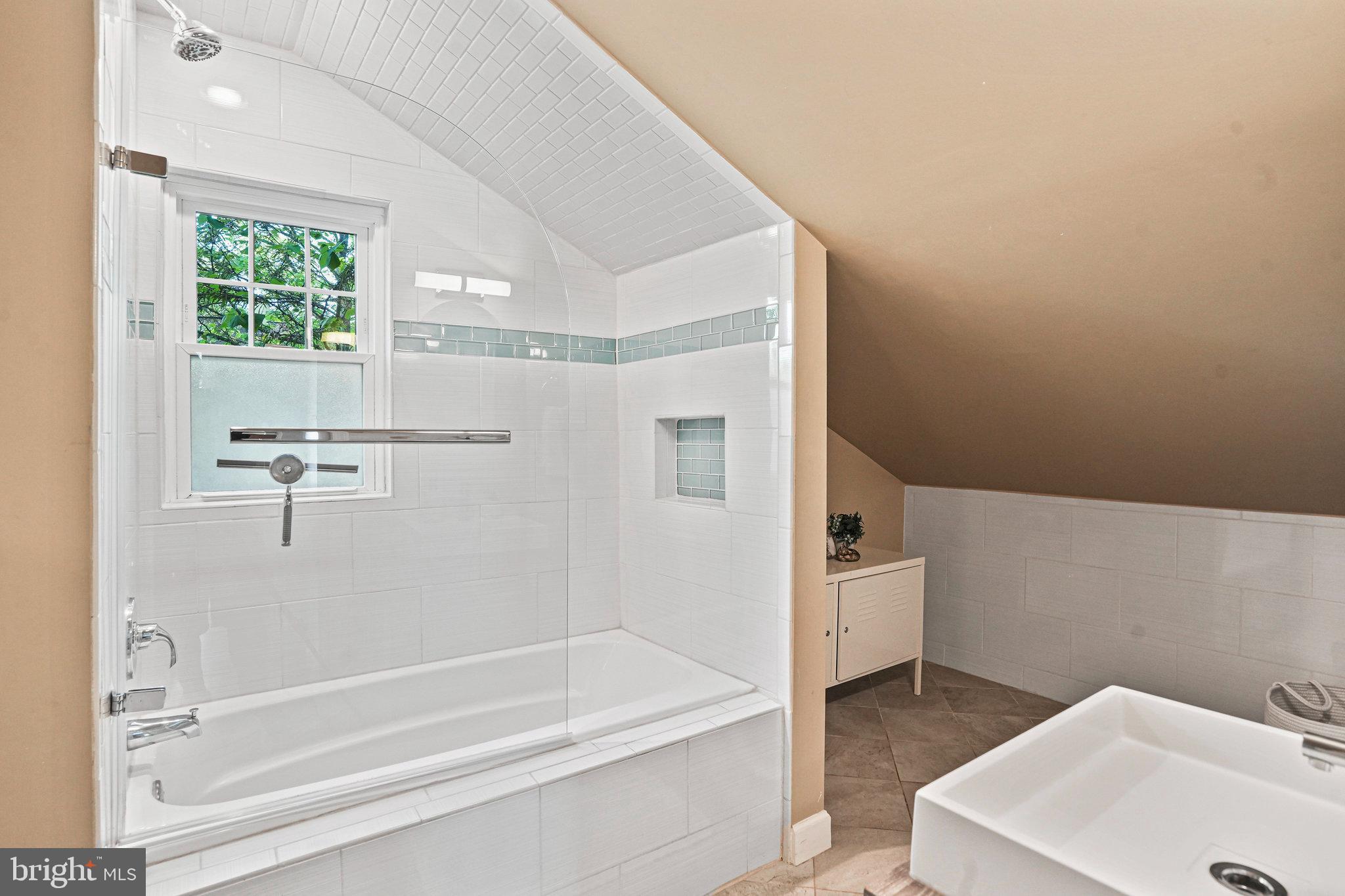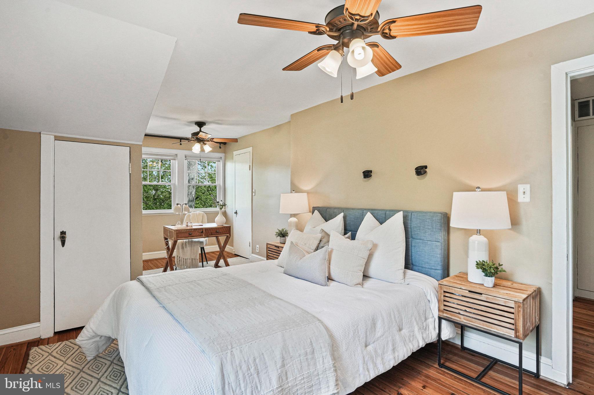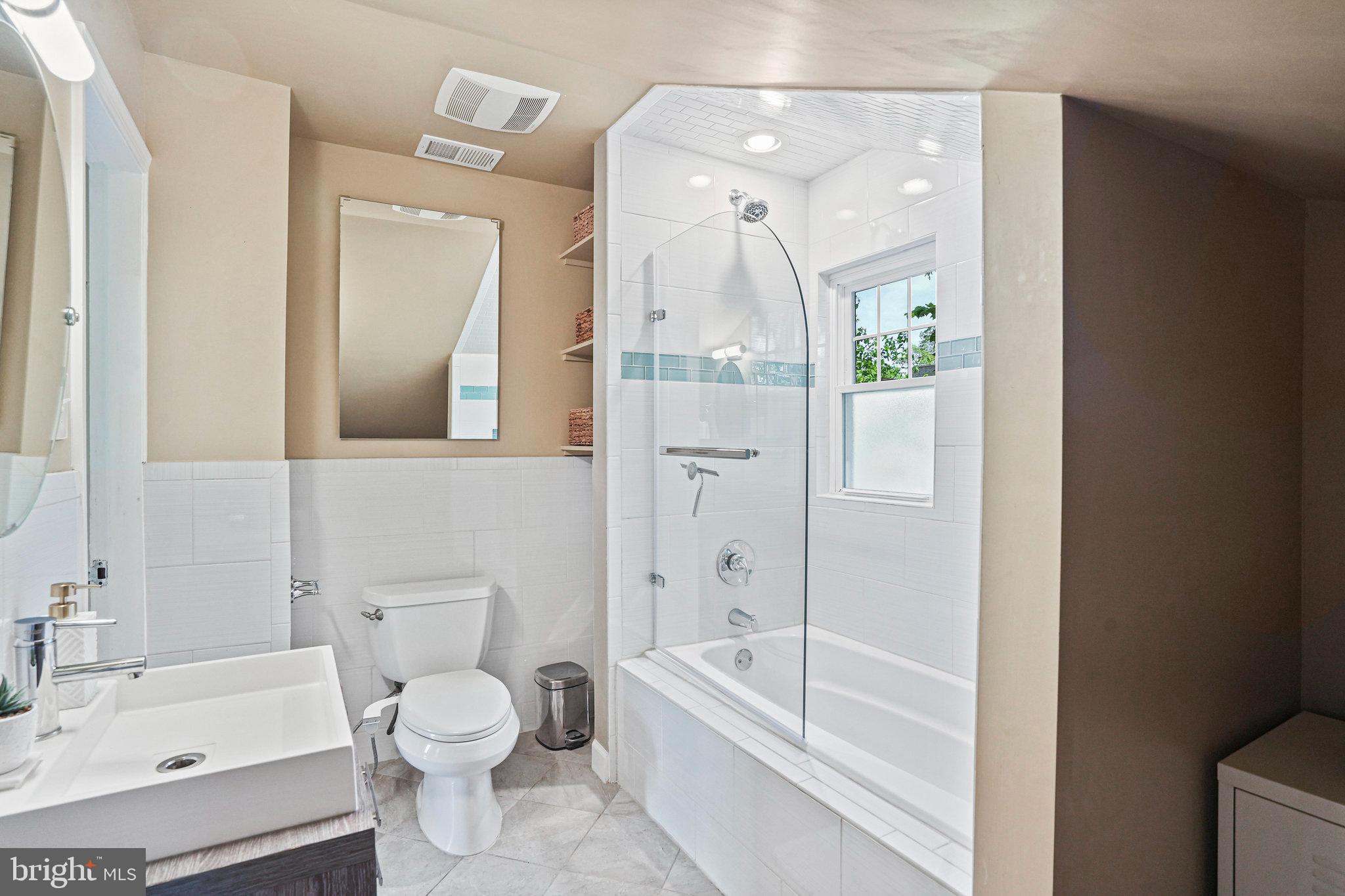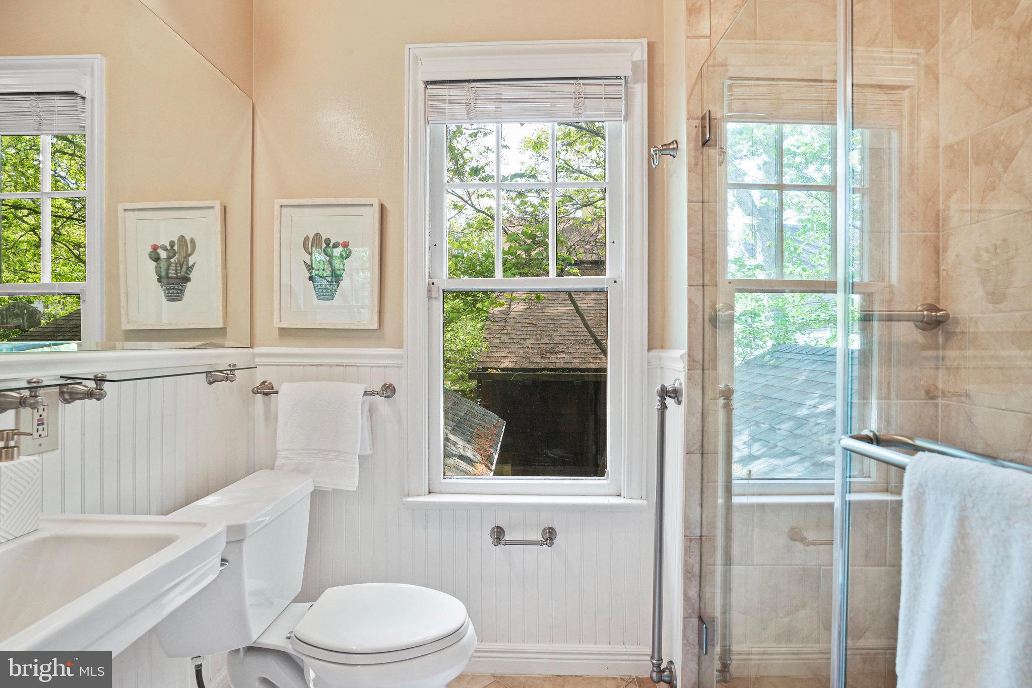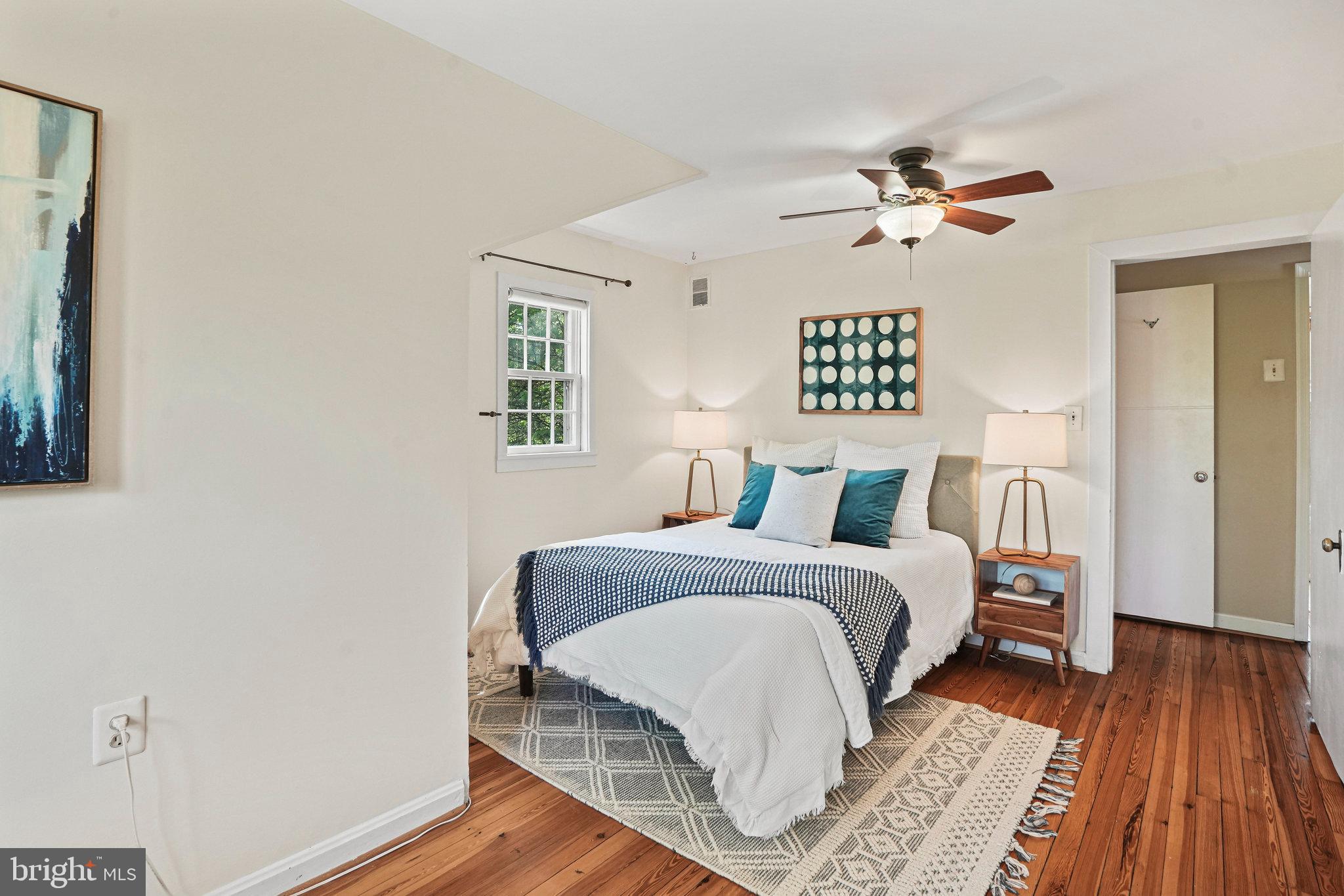 The kitchen is a bright and cheerful space featuring large windows, high ceilings, nearly new appliances, and stone countertops. A cute dining nook at the back offers views through French doors to the green backyard and deck. A first-floor bedroom and updated full bathroom provides privacy- ideal for guests, office or those preferring no-stairs living.